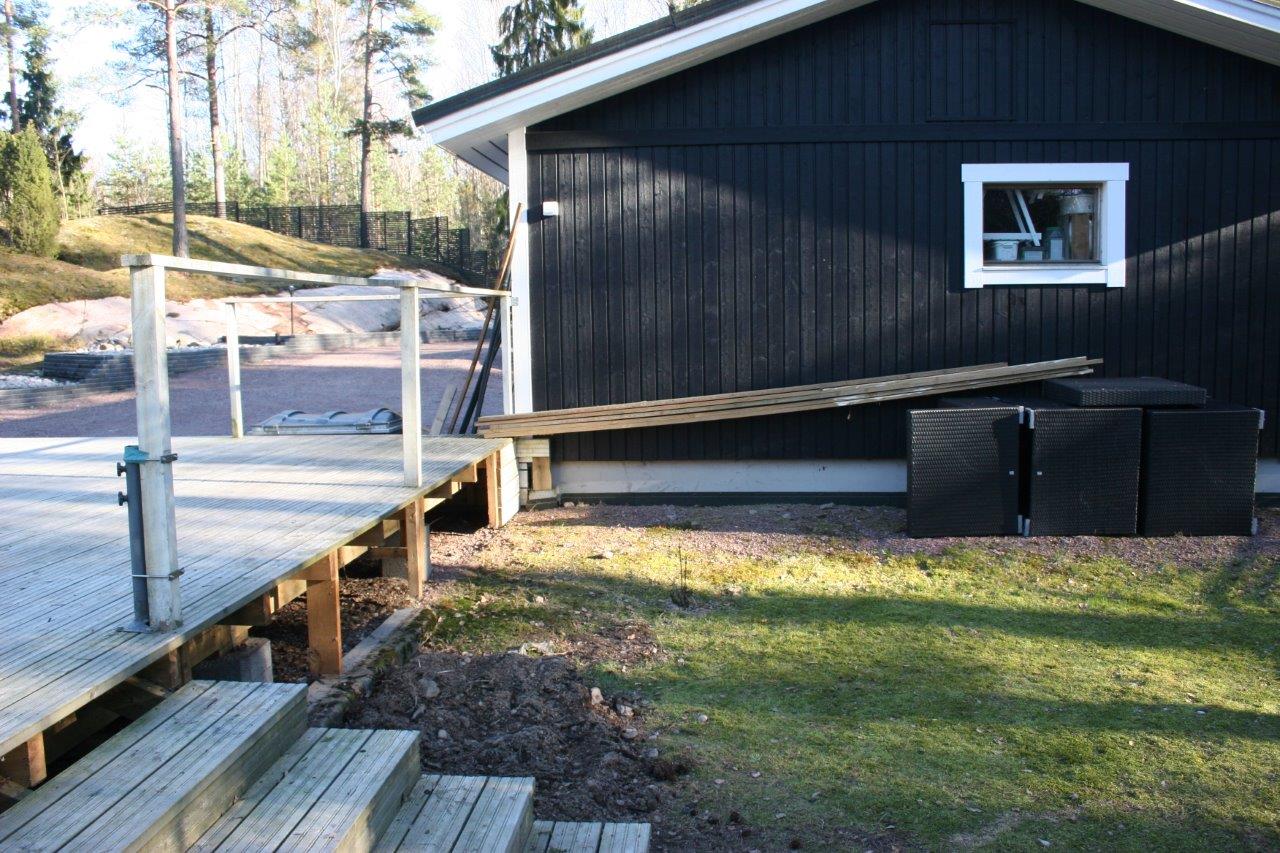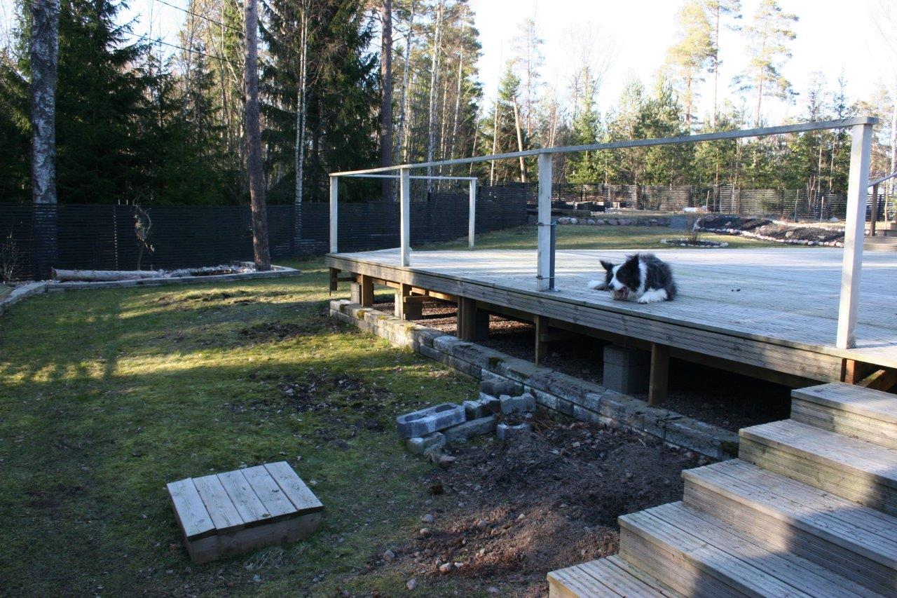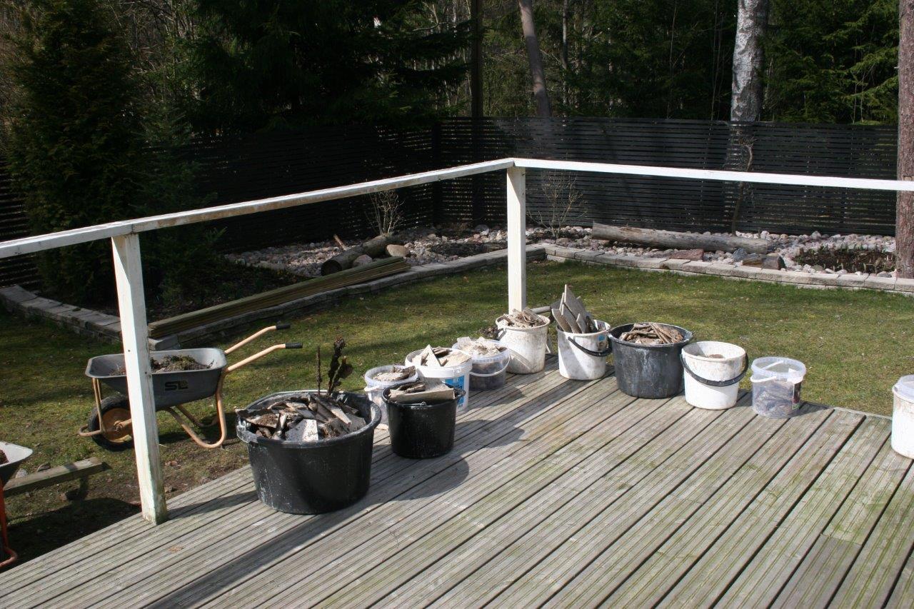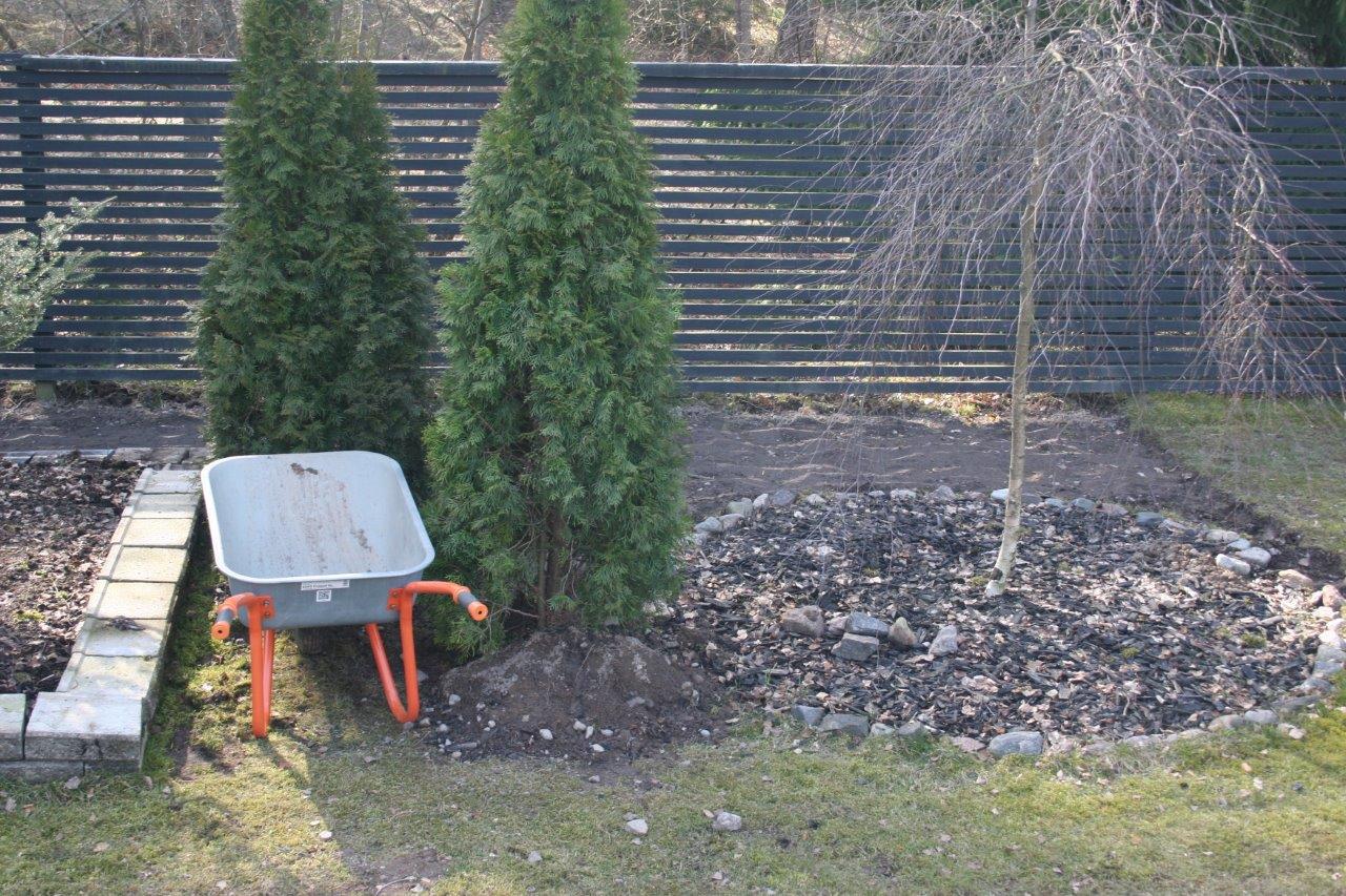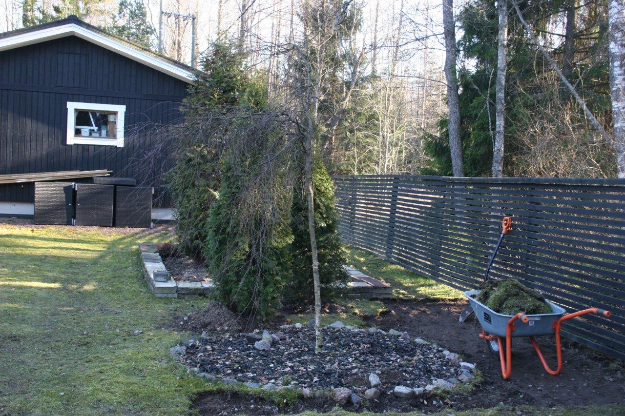 Kun oli tarpeeksi kärräilty maa-aineksia suuntaan jos toiseenkin alkoi terassin ja aidan välinen nurmiosuus olemaan aika huonossa hapessa ja päädyin poistamaan sen kokonaan. Nurmikon leikkaaminen ei varsinaisesti kuulu lempiharrastuksiini, mutta vielä enemmän inhoan nurmikon poistamista :). Onneksi tontilta löytyy aidan ulkopuolelta tilaa johon pystyi dumppaamaan jätenurmikon. Se vielä olisi puuttunut, että sitä olisi pitänyt kärrätä kaatopaikalle. Samalla tuli tilaa dumpata perustuksien alta poistettua maata terassin ja aidan väliin, eikä tarvinnut kärrätä sitä lievään ylämäkeen tontin takanurkkaan.