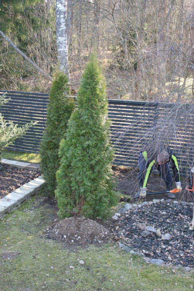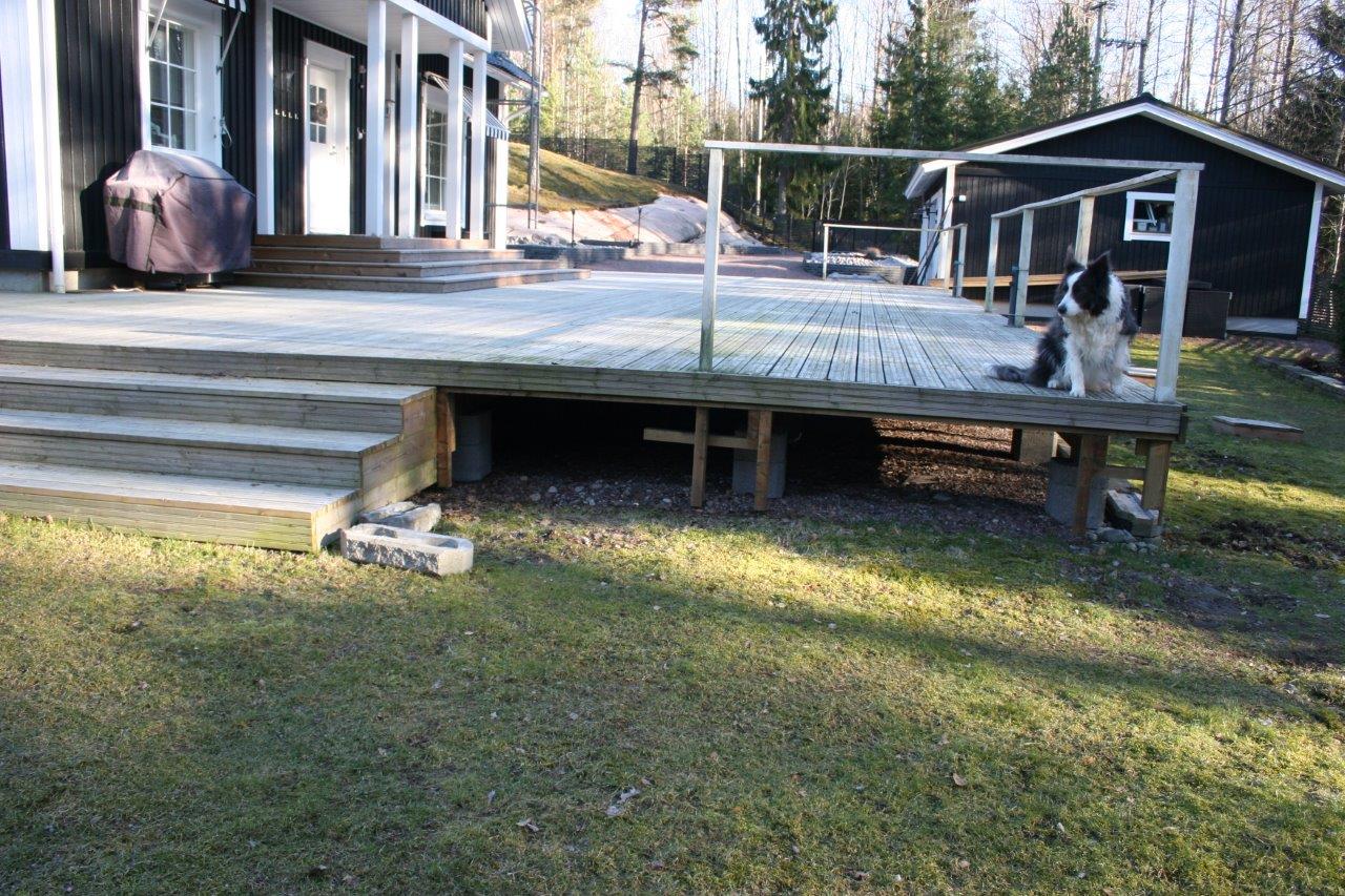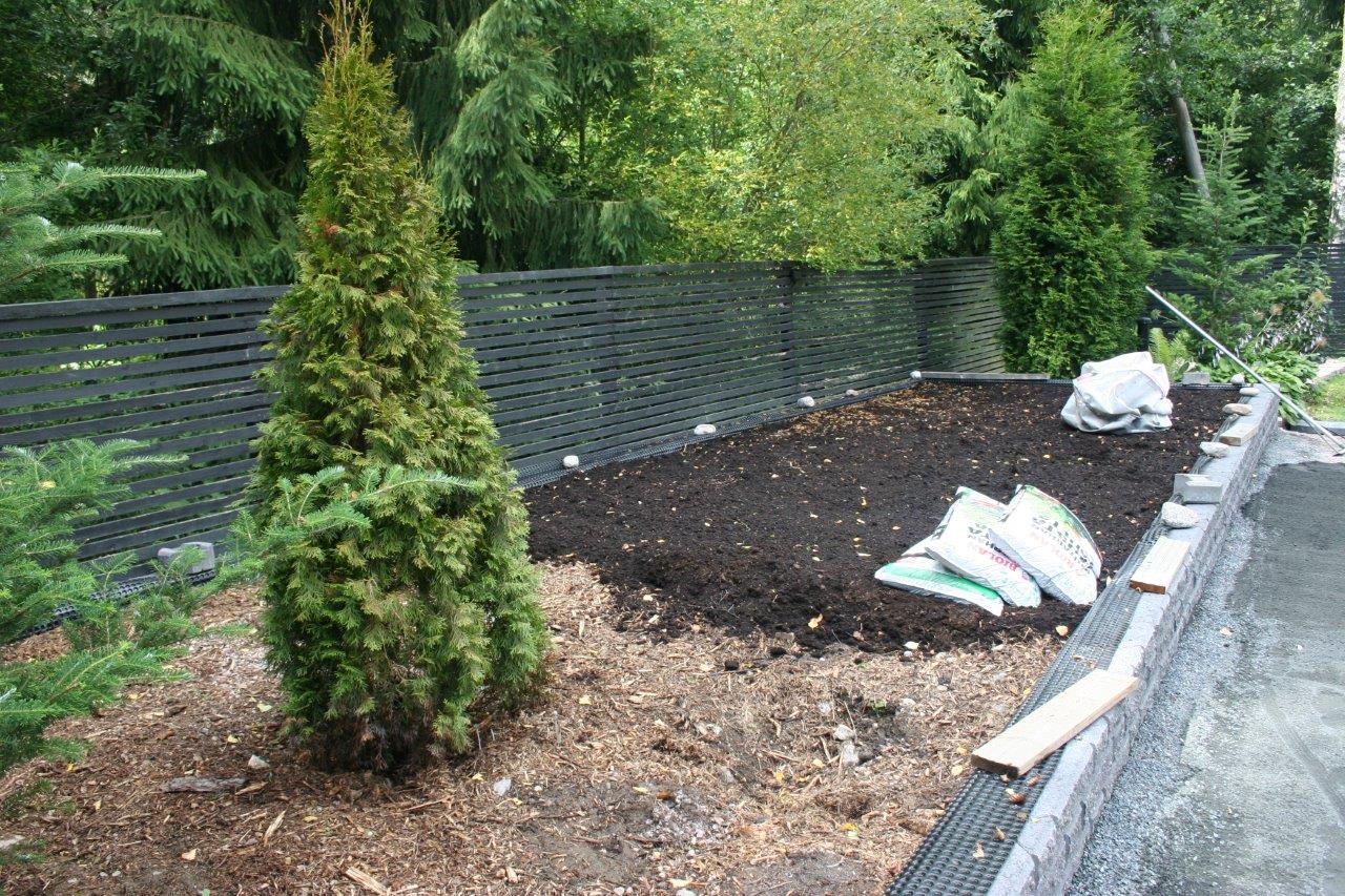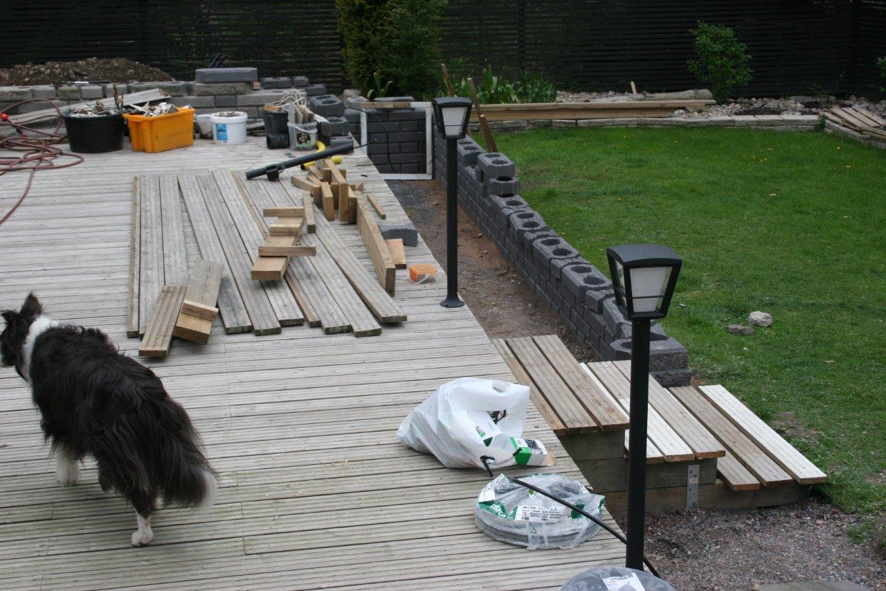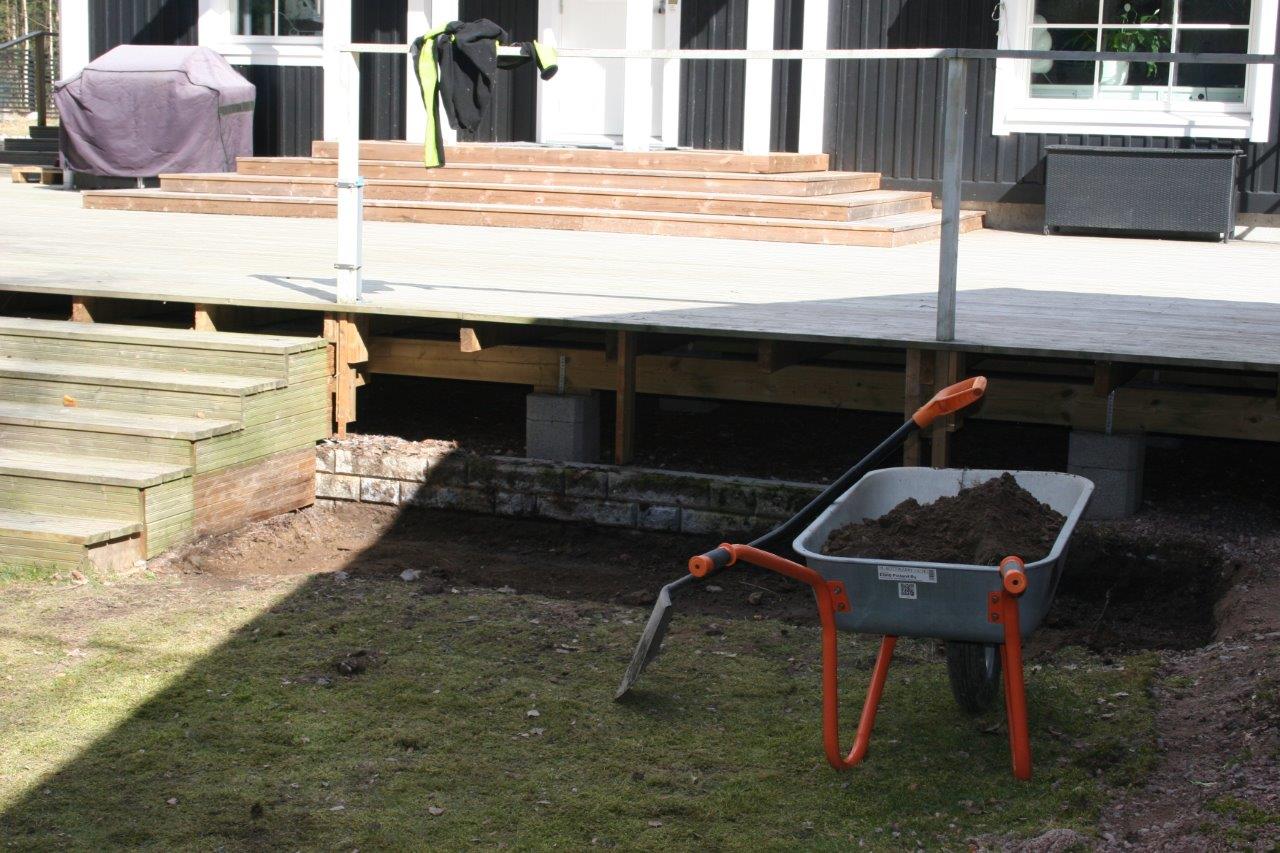Kun oli tarpeeksi kärräilty maa-aineksia suuntaan jos toiseenkin alkoi terassin ja aidan välinen nurmiosuus olemaan aika huonossa hapessa ja päädyin poistamaan sen kokonaan. Nurmikon leikkaaminen ei varsinaisesti kuulu lempiharrastuksiini, mutta vielä enemmän inhoan nurmikon poistamista :). Onneksi tontilta löytyy aidan ulkopuolelta tilaa johon pystyi dumppaamaan jätenurmikon. Se vielä olisi puuttunut, että sitä olisi pitänyt kärrätä kaatopaikalle. Samalla tuli tilaa dumpata perustuksien alta poistettua maata terassin ja aidan väliin, eikä tarvinnut kärrätä sitä lievään ylämäkeen tontin takanurkkaan.