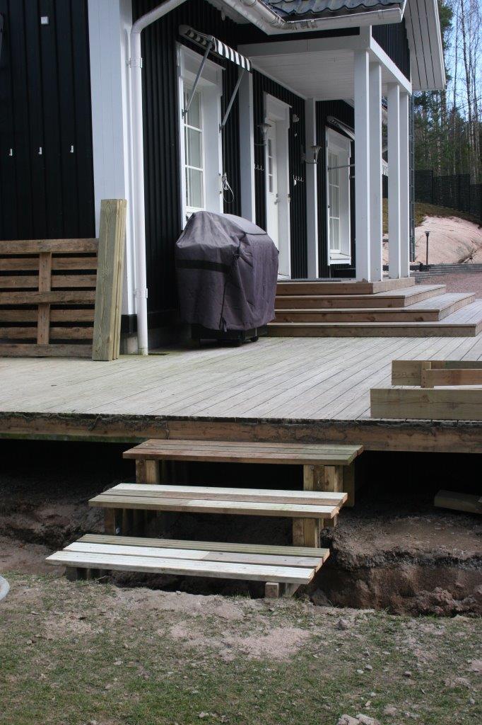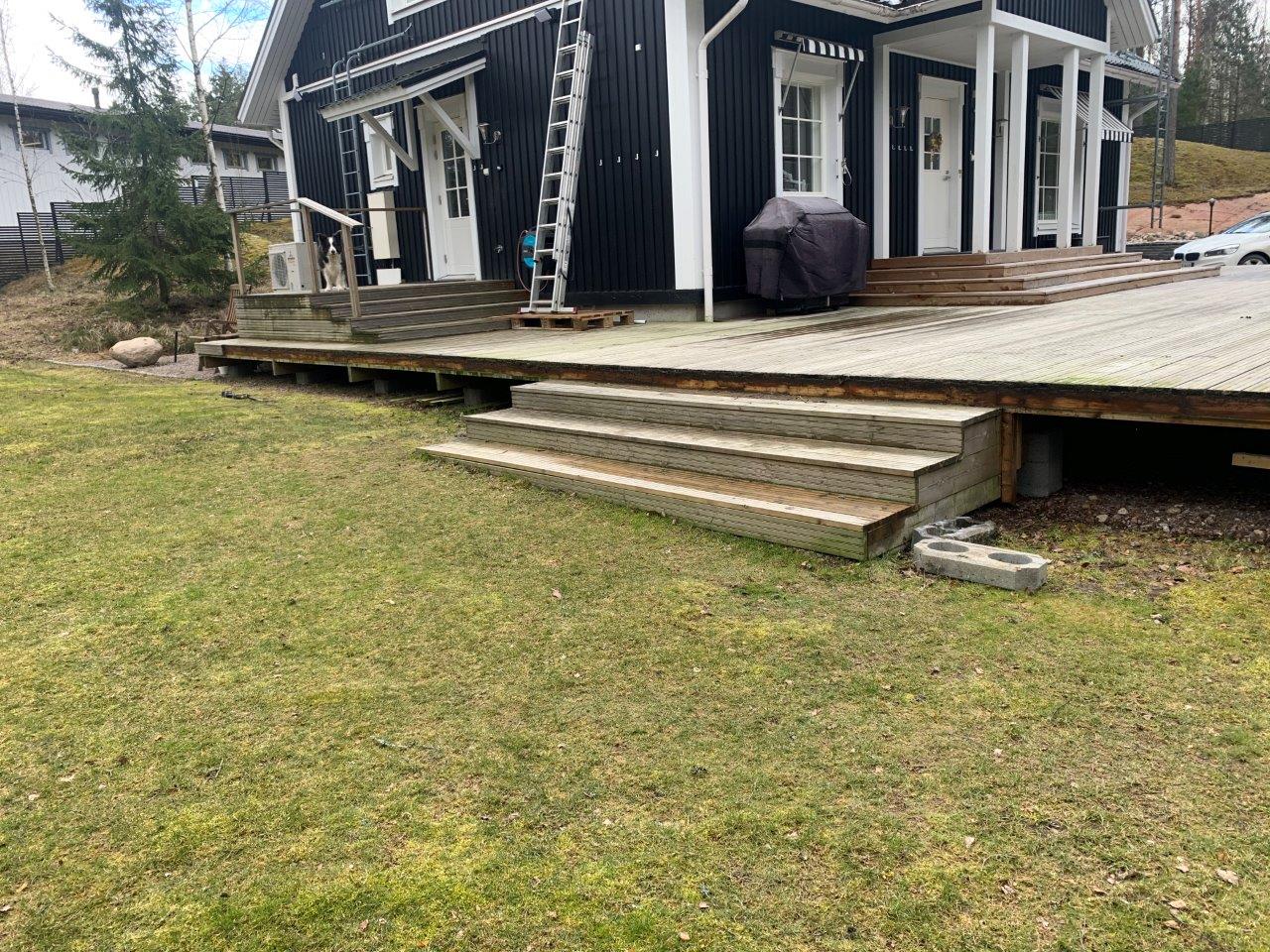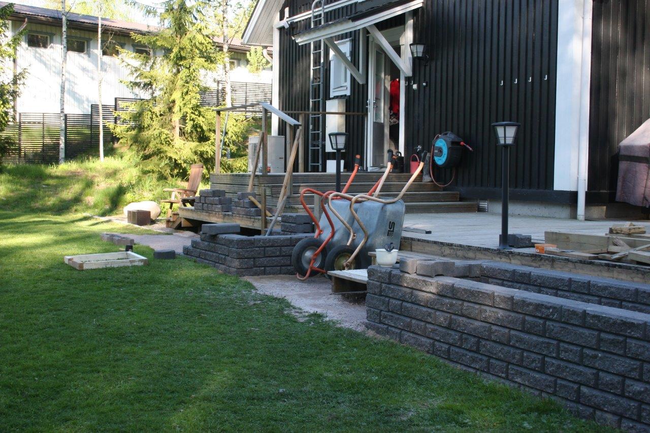 Terassin portaiden purkua ja nurmikon poistoa. Maa-aineksen poistoa istutuslaatikoiden perustuksien tieltä.