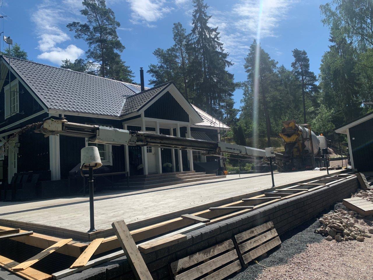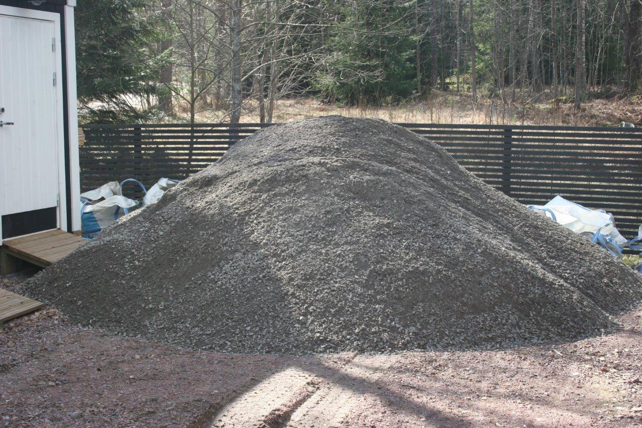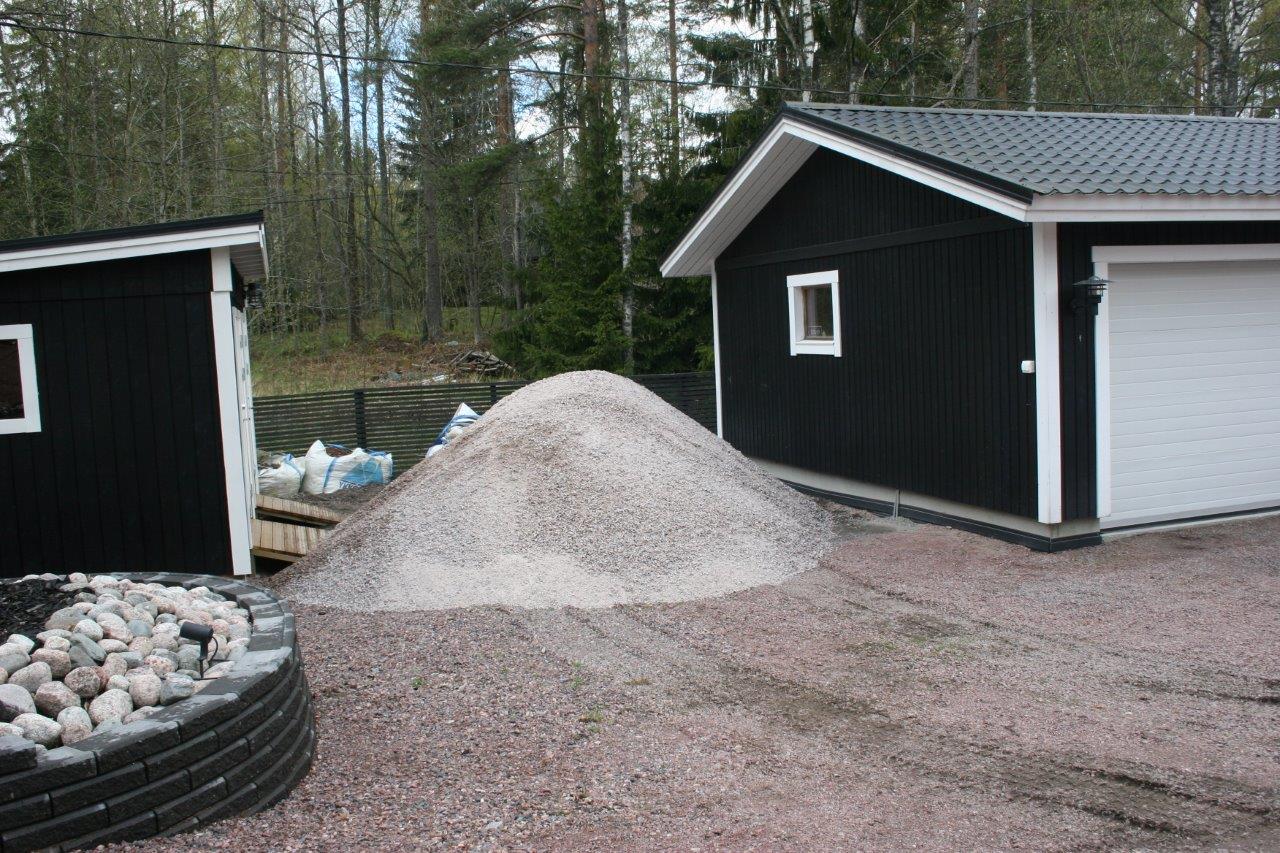 Tässä vaiheessa alkoi olla jo mitta aika täynnä lapioimiseen ja kottikärryllä ajeluun. Joten tämä osuus hoitui kuljetusliike Mikanderin hihnaautolla, joka pystyi heittämään murskeen paikalleen noin 16 metrin päästä. Pääosin murske osui sinne mihin pitikin, mutta osa päätyi terassille, jonka joutui lopuksi harjaamaan ja pesemään (huomattavasti pienempi vaiva kuin noin 15 tonnin kottikärrääminen).