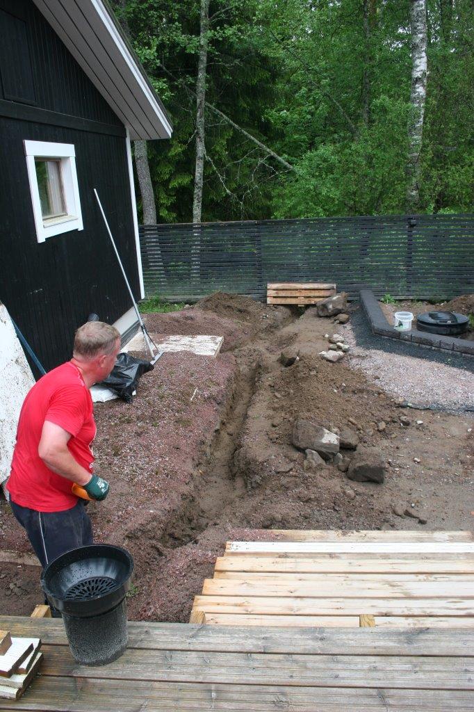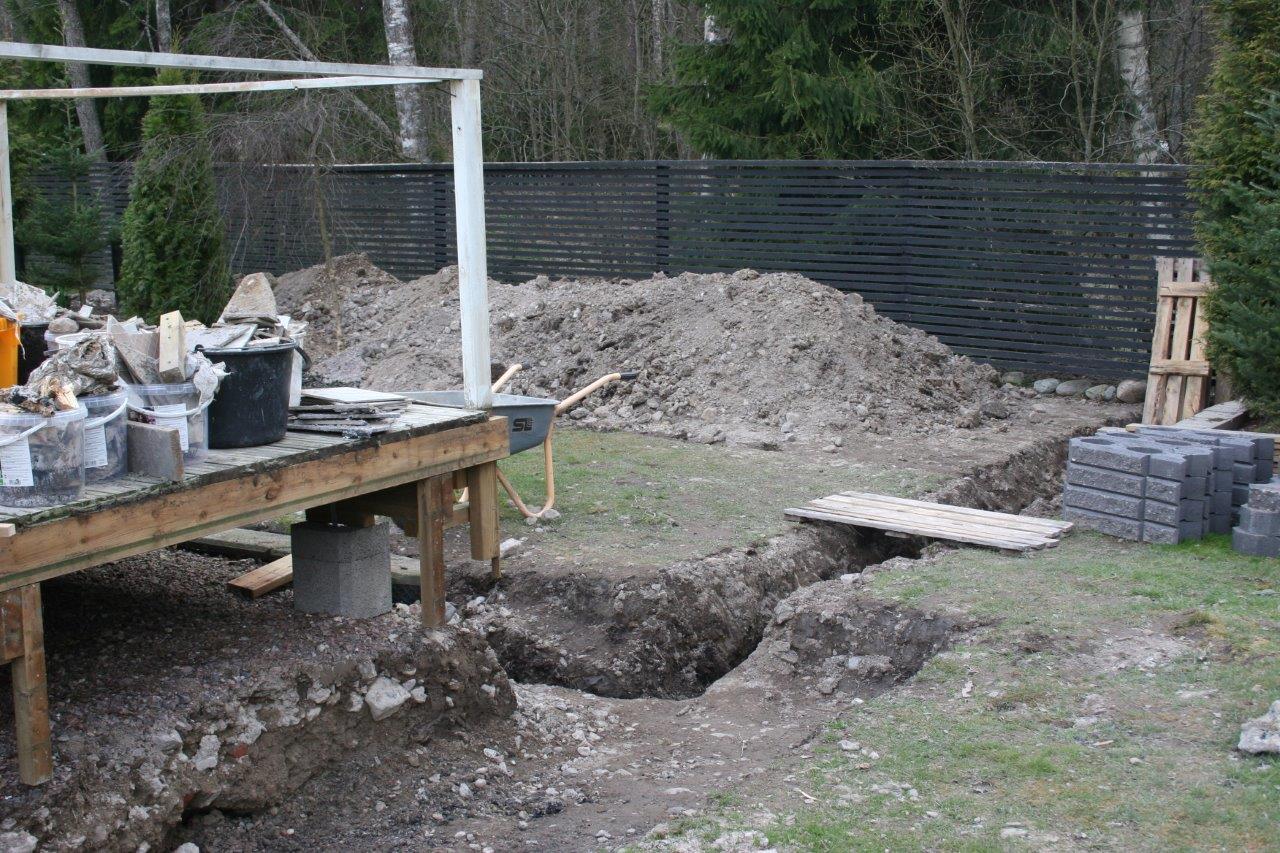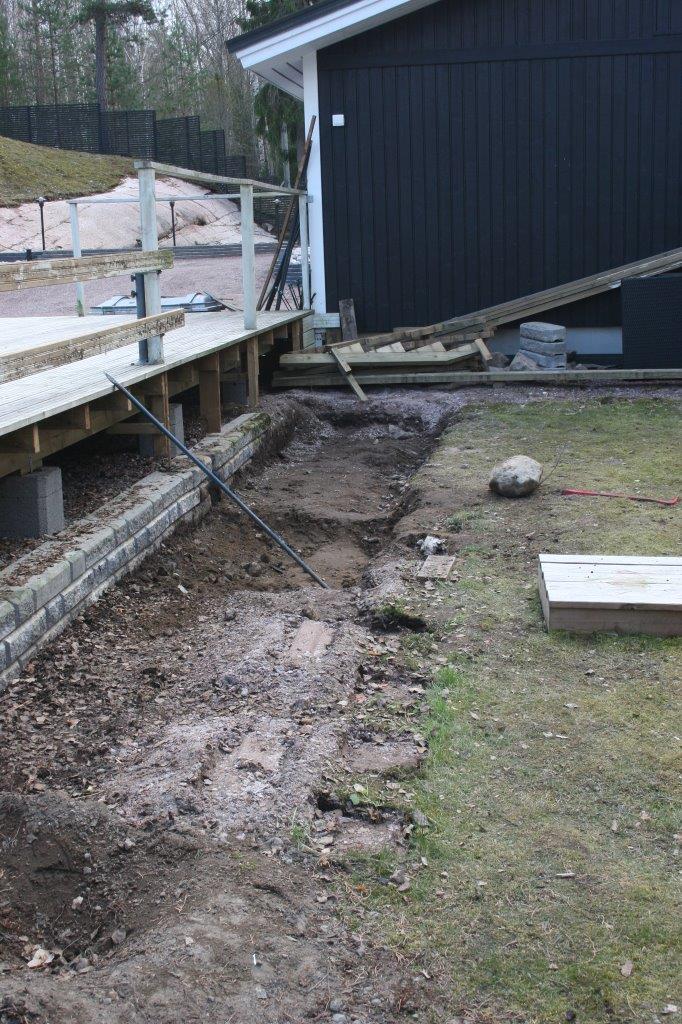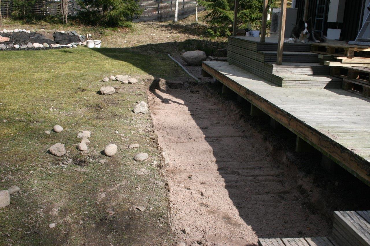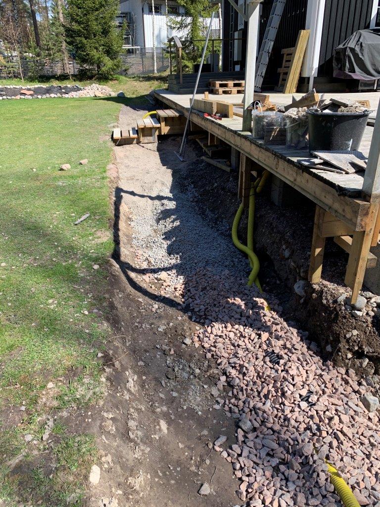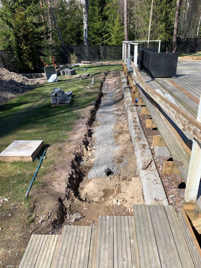 Terassin kulmalta aidalle olevaan kaivantoon meni myös 2 kpl 50mm (keltaista) putkea sähköjohtoja varten.