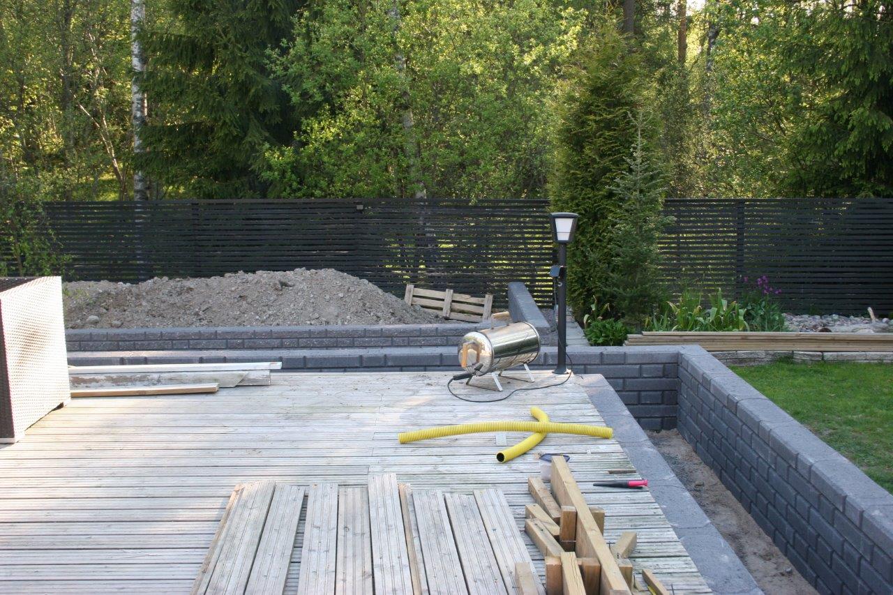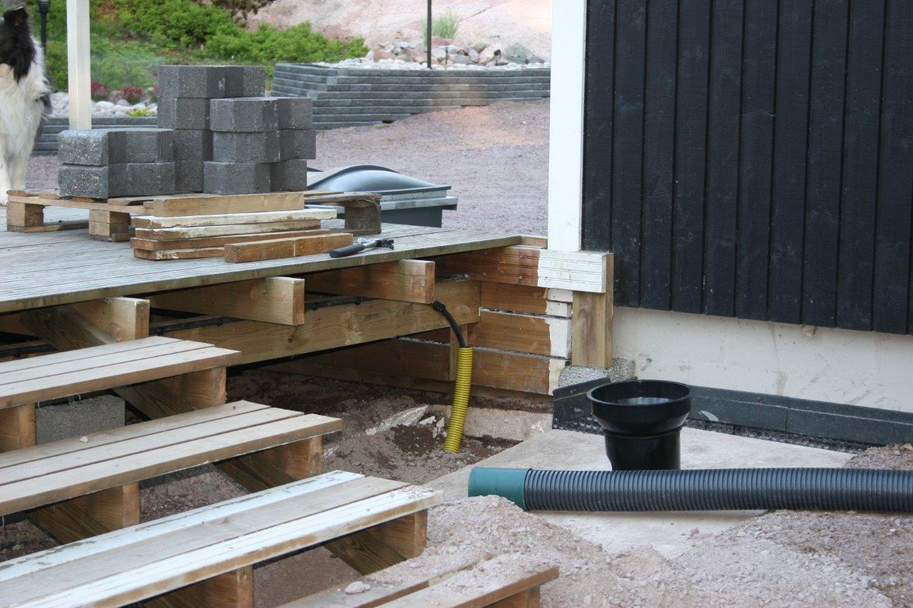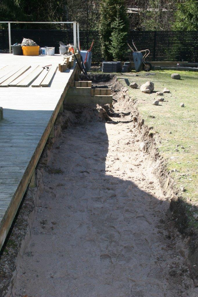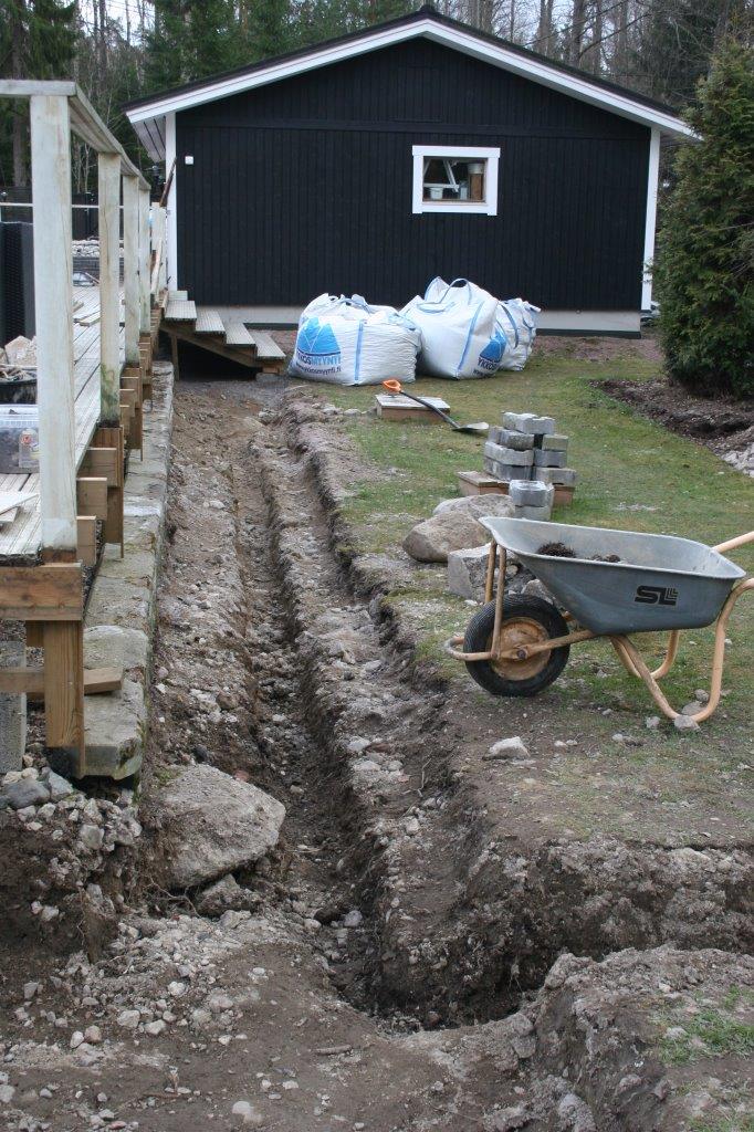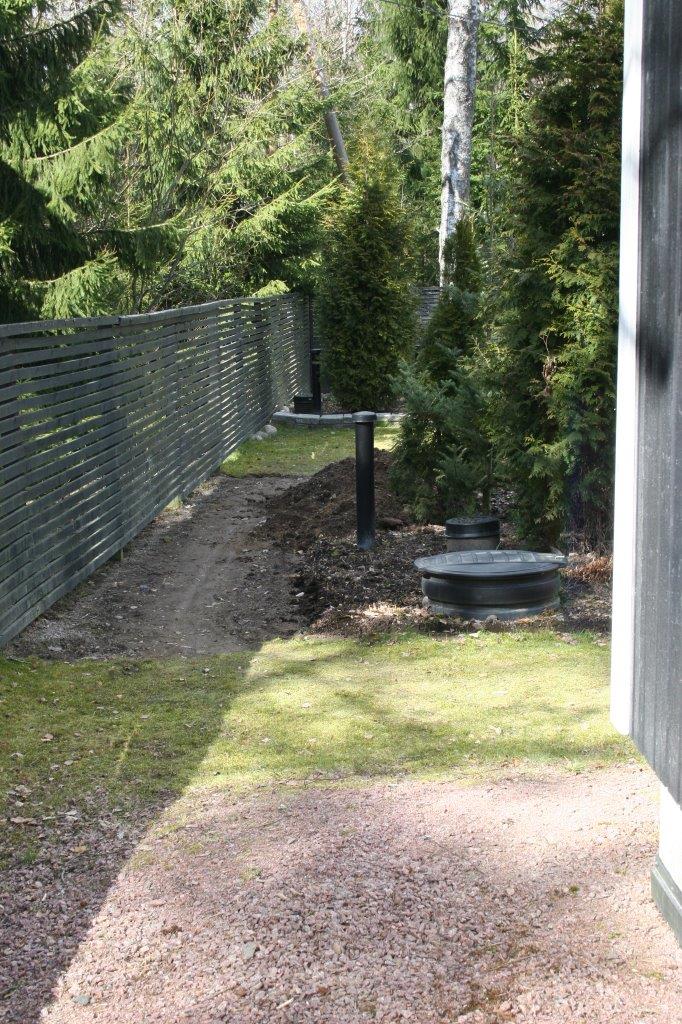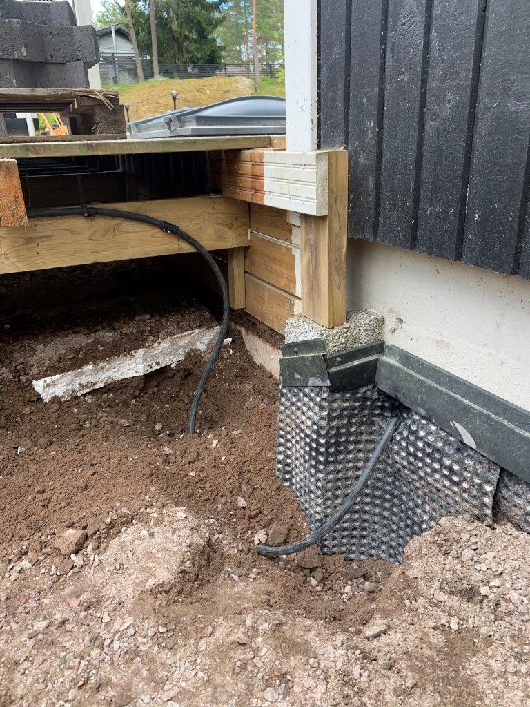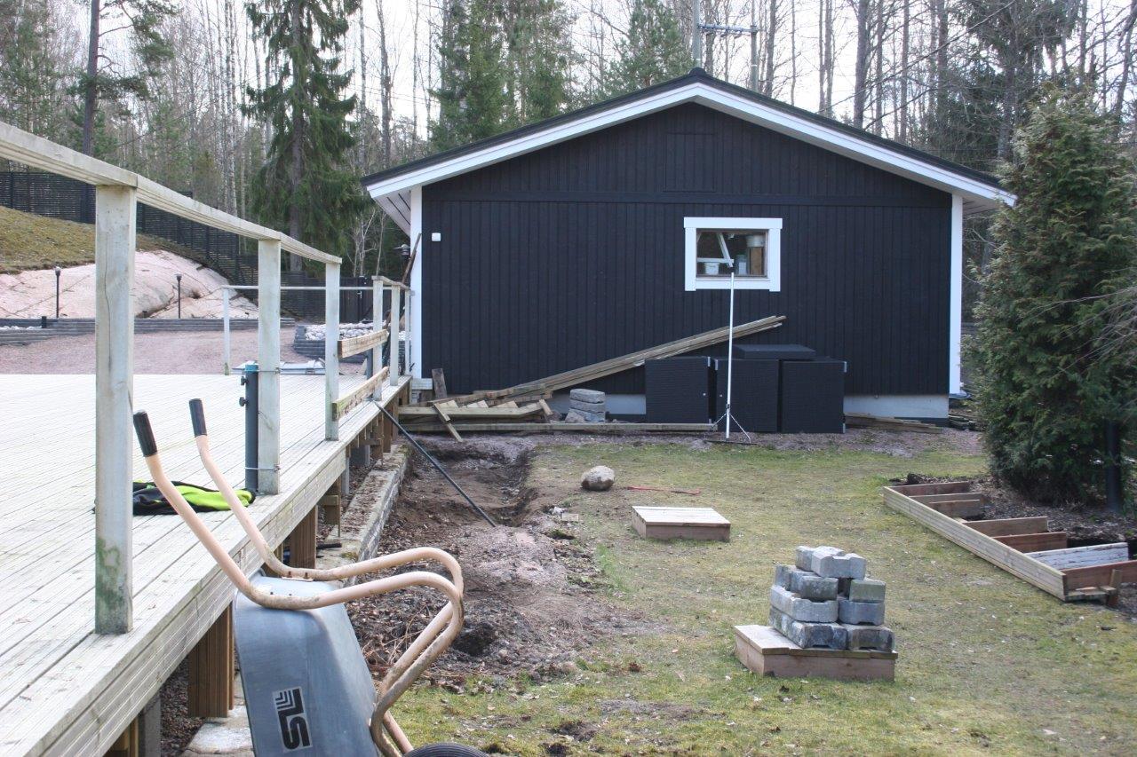 Terassin kulmalta aidalle olevaan kaivantoon meni myös 2 kpl 50mm (keltaista) putkea sähköjohtoja varten.