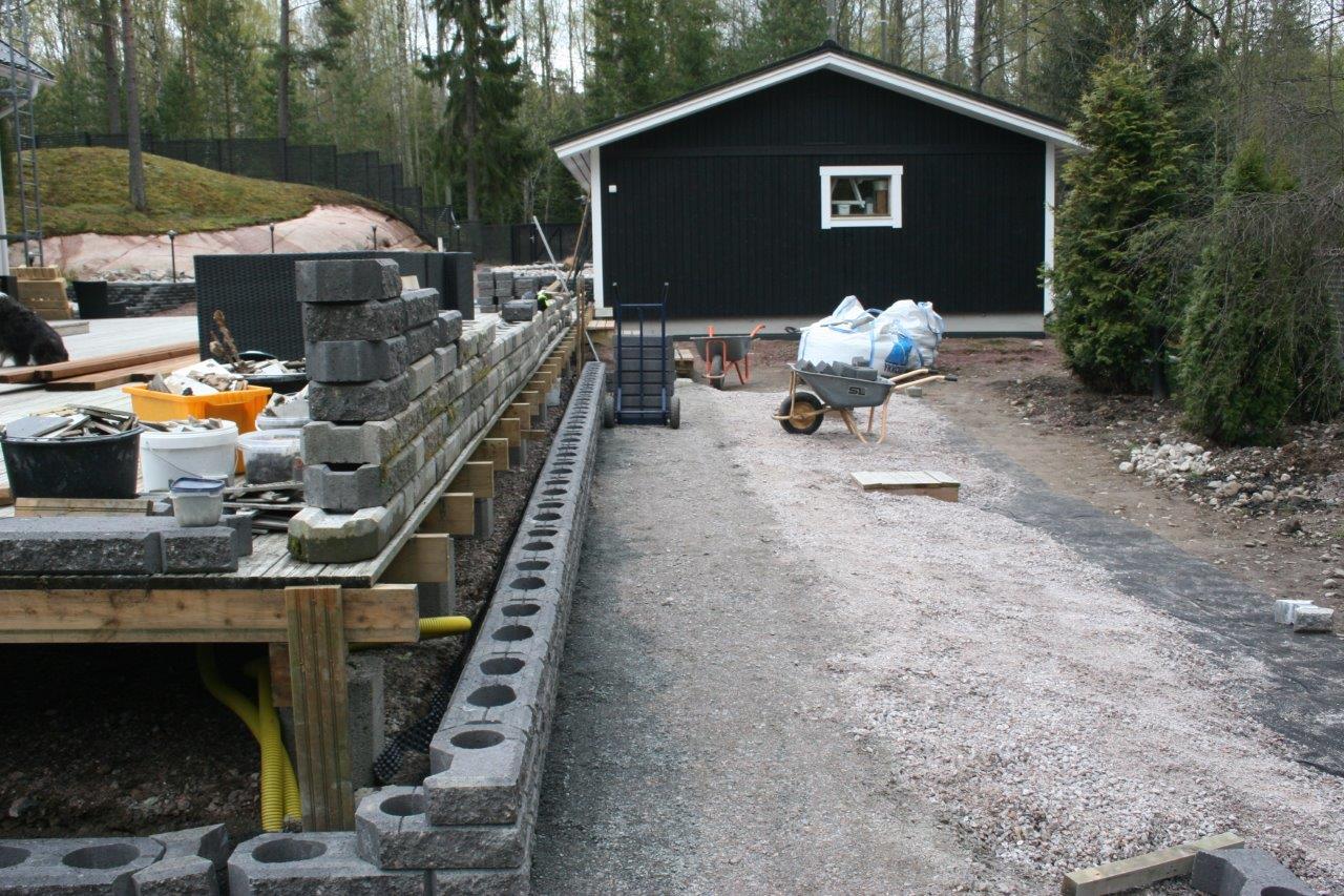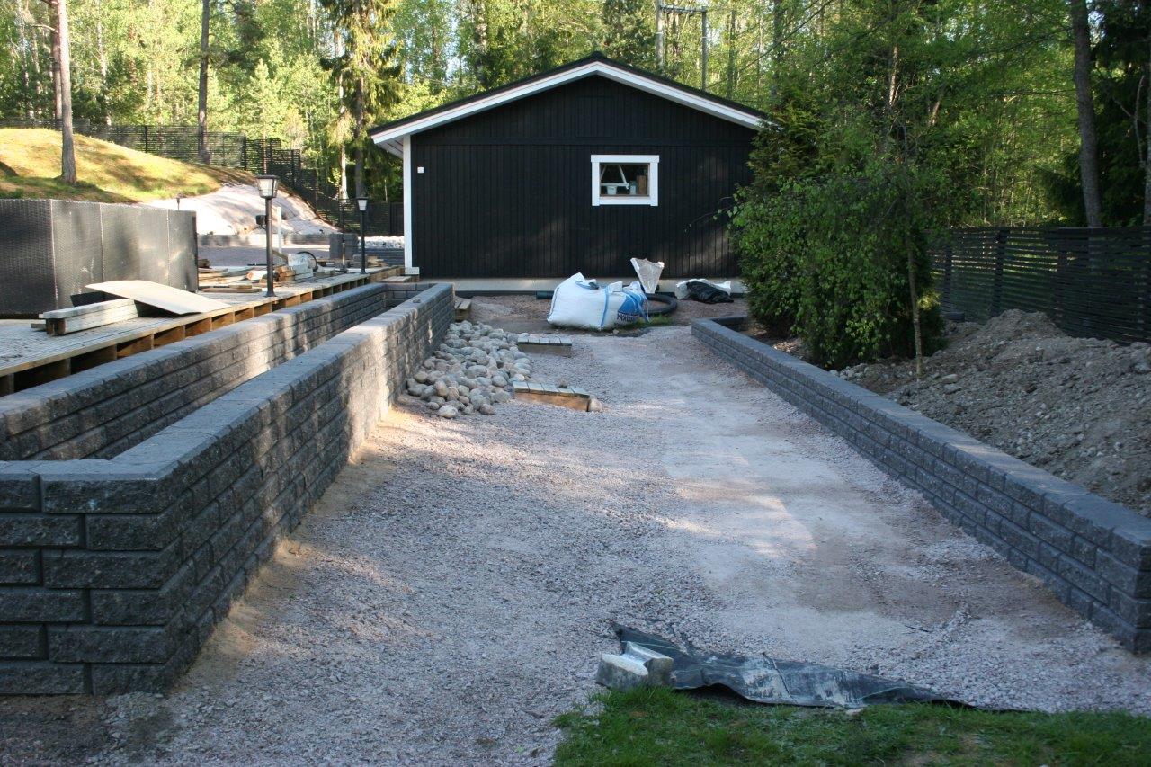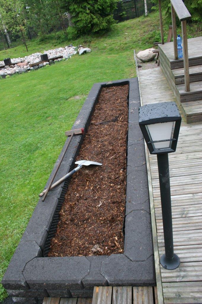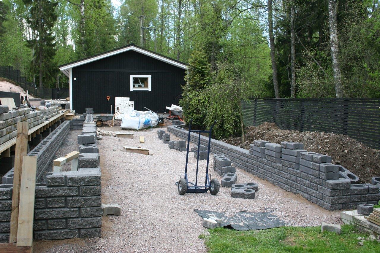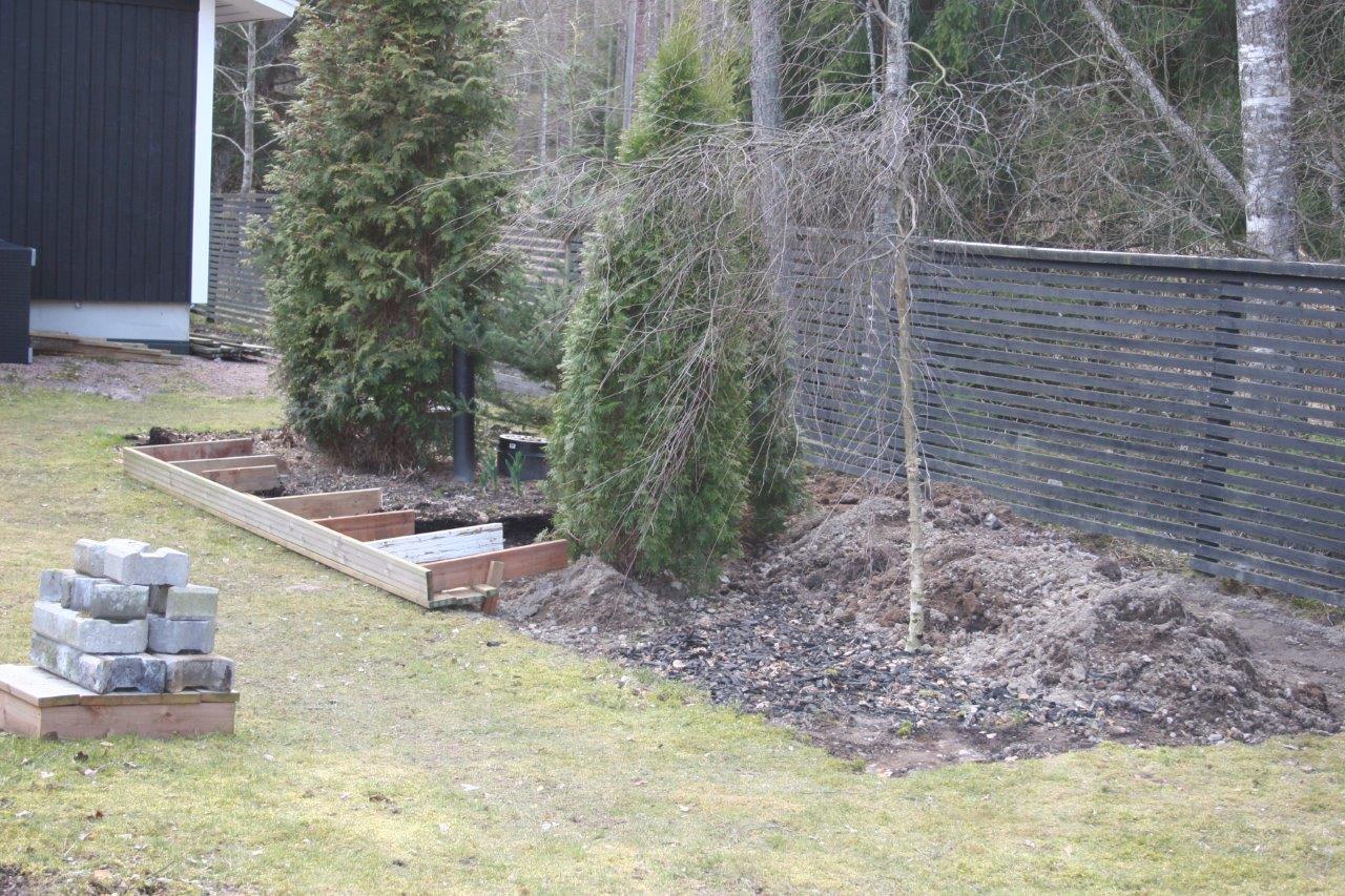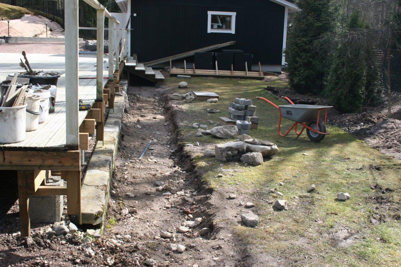 Koska vallikivistä tehtävien istutuslaatikoiden korkeus olisi suurimmillaan 70 cm, piti tehdä perustukset huolella, ettei ”muurit” murtuisi/kaatuisi heti ensimmäisen talven ja routimisen seurauksena. Lisäksi edellisen kesän muureista viisastuneena, laitoin salaojituksen laatikoiden pohjalle.