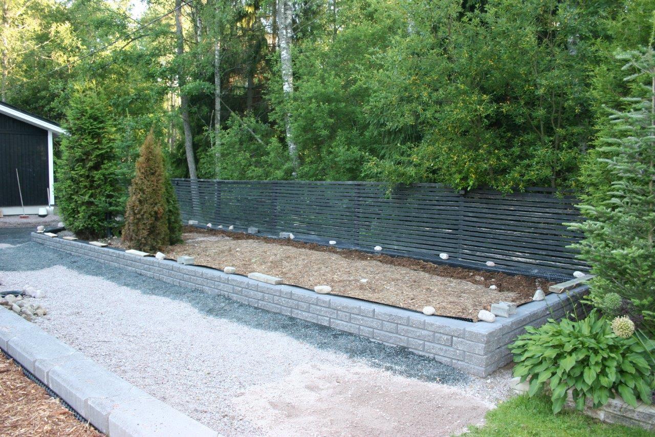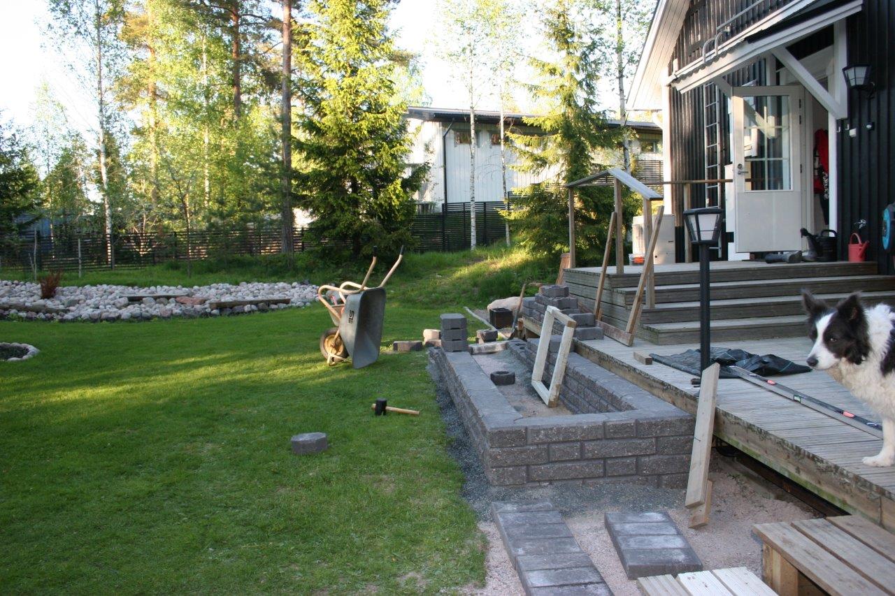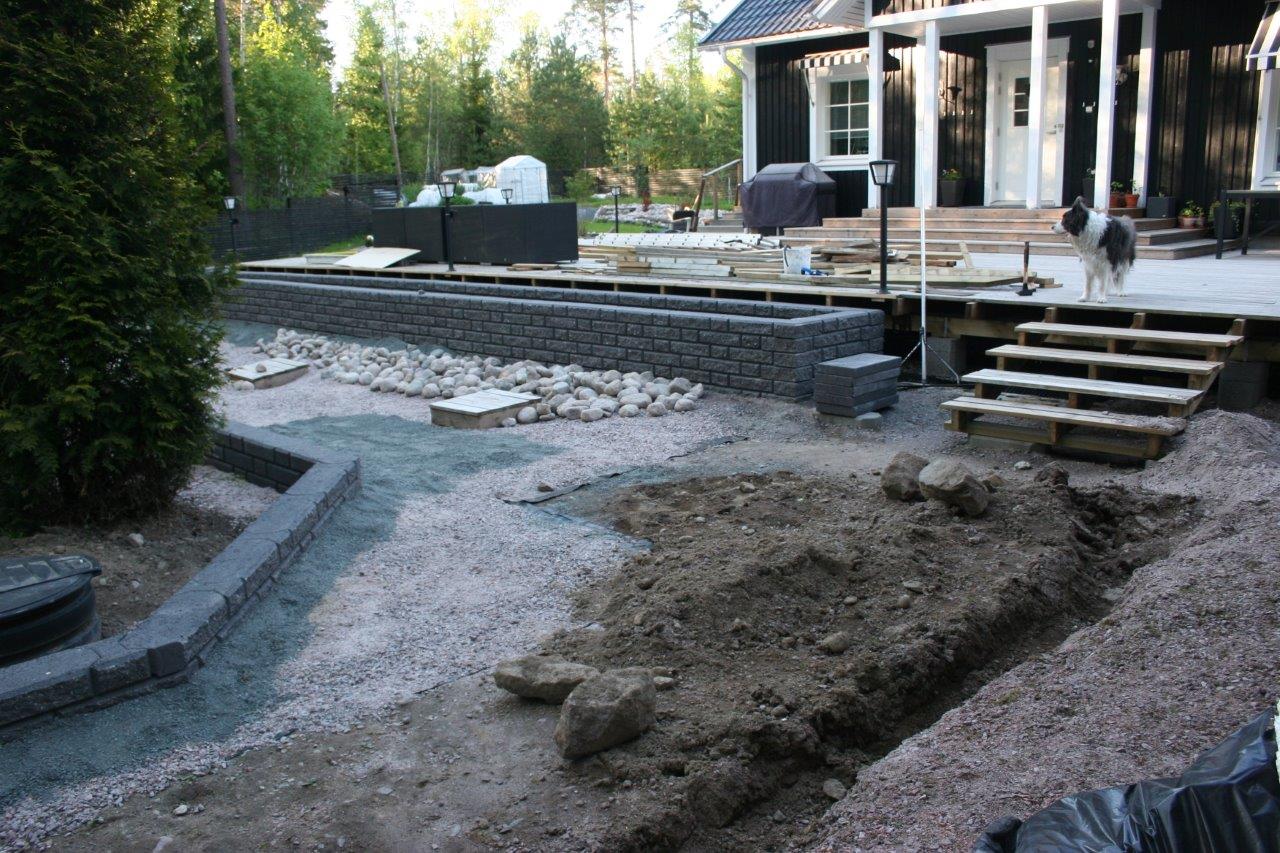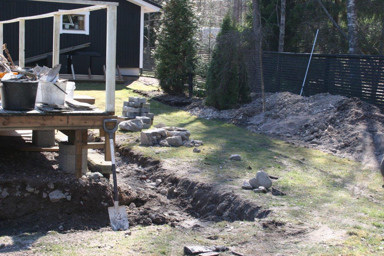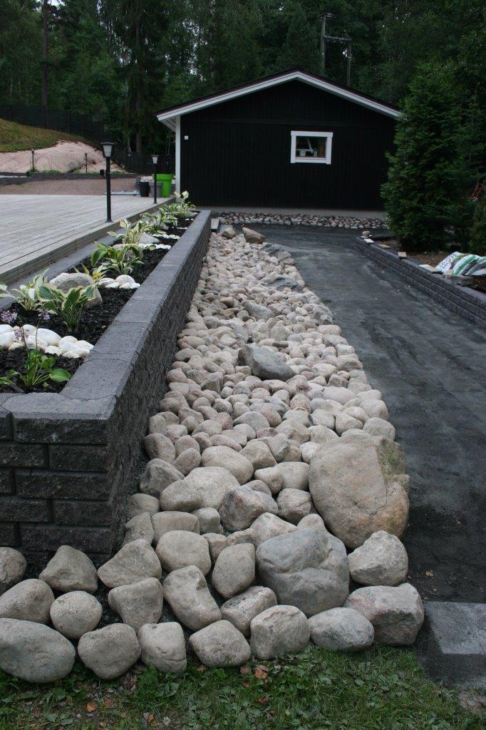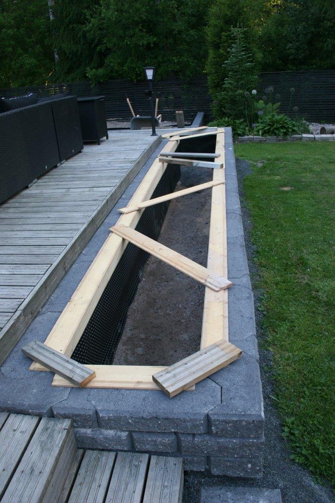 Koska vallikivistä tehtävien istutuslaatikoiden korkeus olisi suurimmillaan 70 cm, piti tehdä perustukset huolella, ettei ”muurit” murtuisi/kaatuisi heti ensimmäisen talven ja routimisen seurauksena. Lisäksi edellisen kesän muureista viisastuneena, laitoin salaojituksen laatikoiden pohjalle.