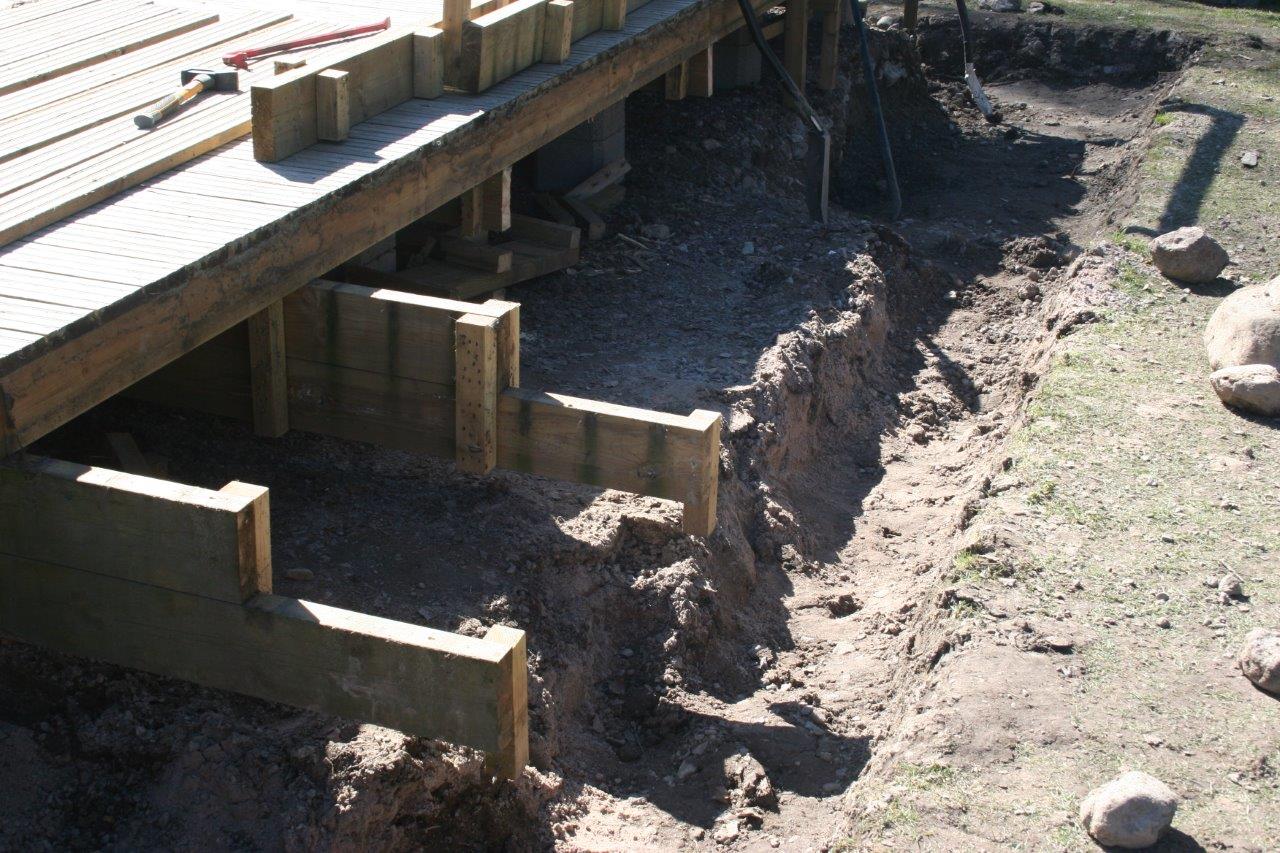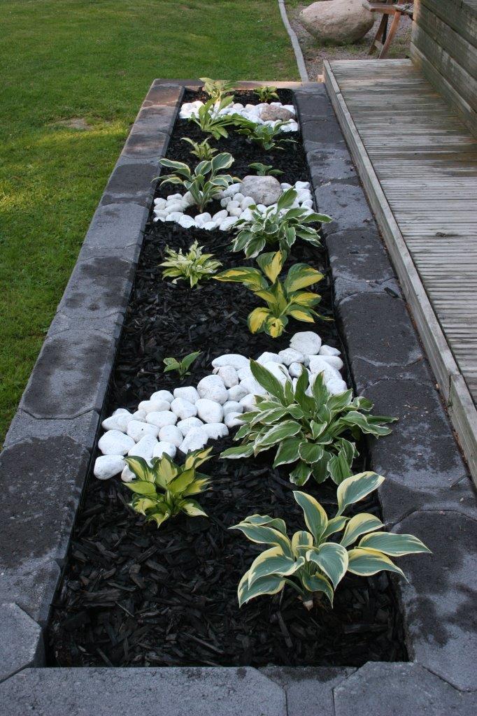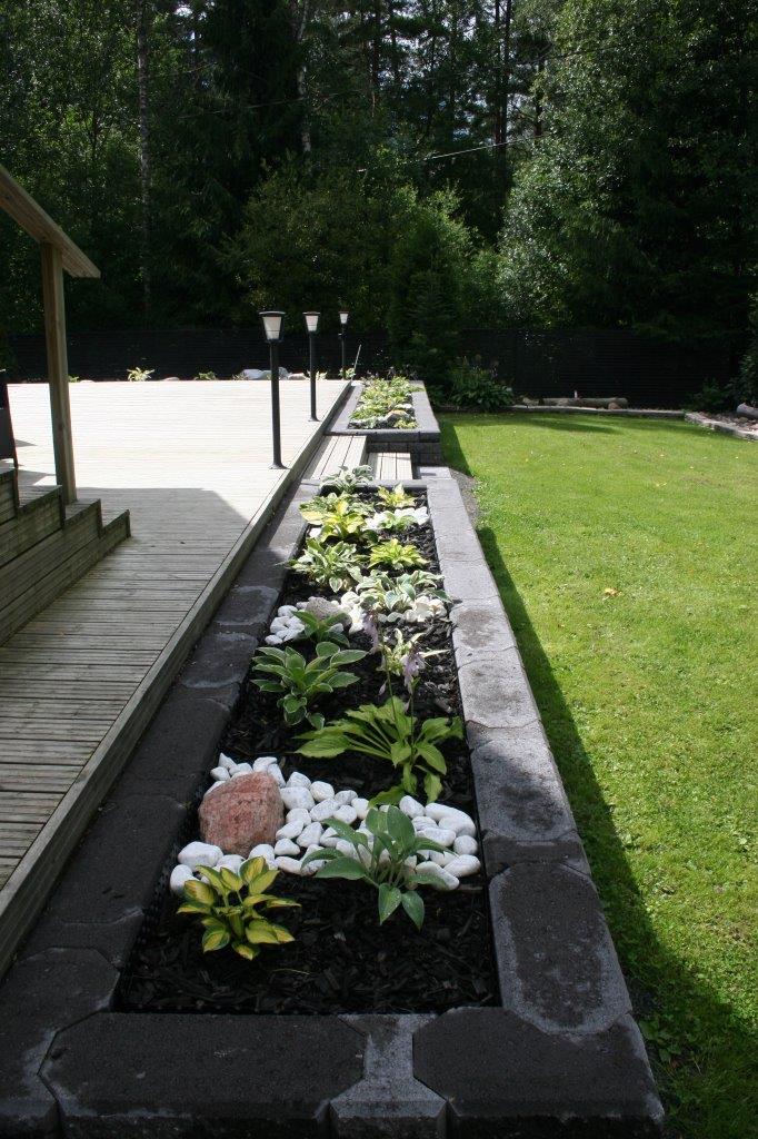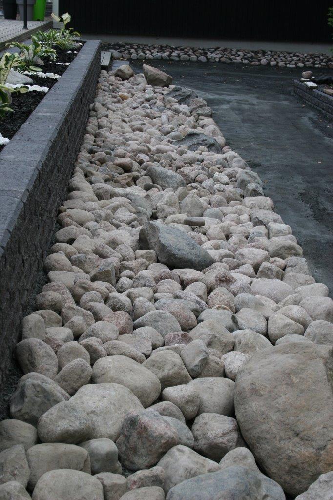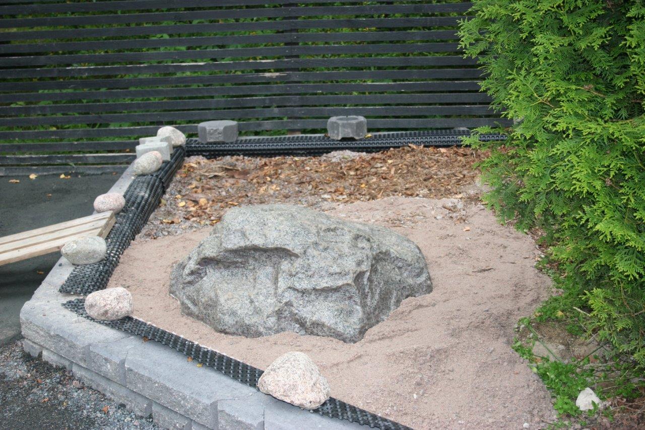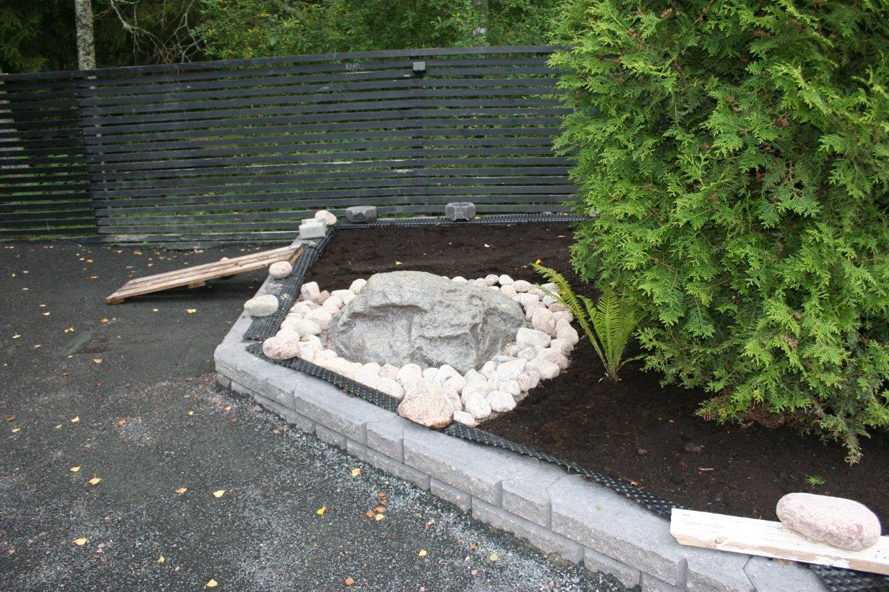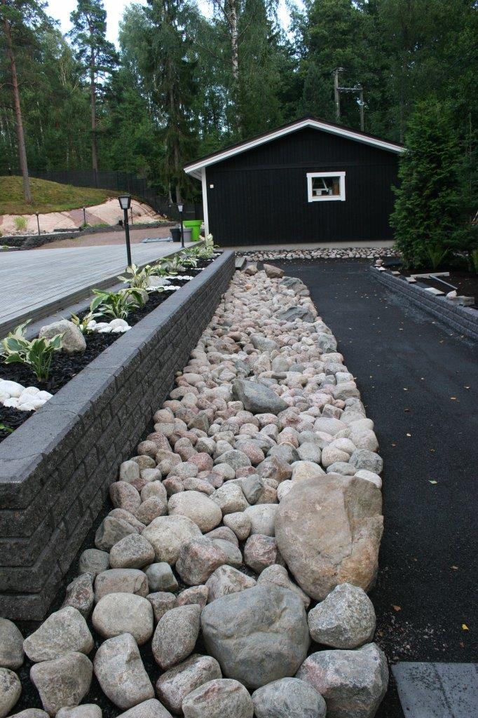 Koska vallikivistä tehtävien istutuslaatikoiden korkeus olisi suurimmillaan 70 cm, piti tehdä perustukset huolella, ettei ”muurit” murtuisi/kaatuisi heti ensimmäisen talven ja routimisen seurauksena. Lisäksi edellisen kesän muureista viisastuneena, laitoin salaojituksen laatikoiden pohjalle.