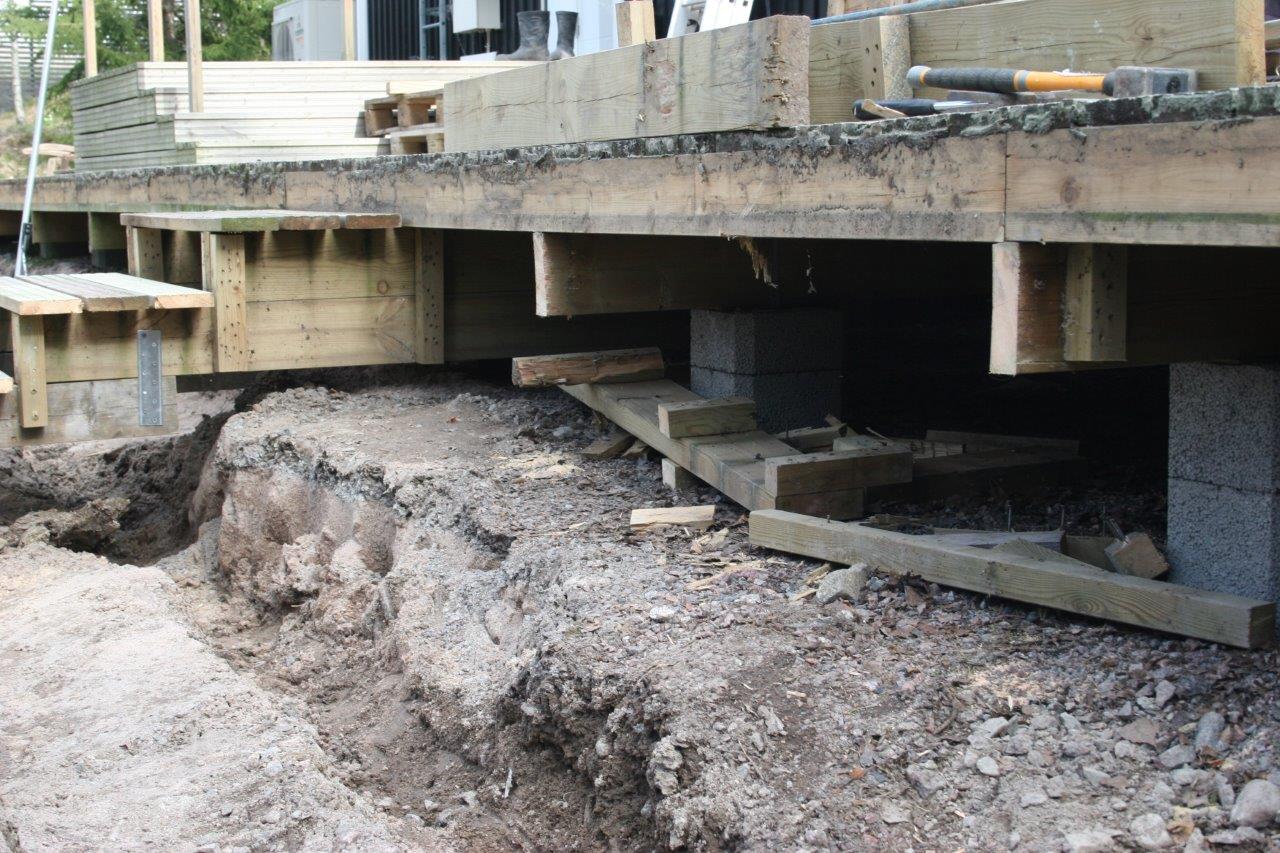 Lisäksi piti purkaa uuden vallikivimuurin paikalta vanhaa vallikivirakennelmaa, oli muutaman sentin liian sisällä + kivien juoksu ei osunut yhteen uuden muurin kanssa. Jotta terassin alla oleva maa-aines ei pääsisi liikahtamaan, niin vanhoja kiviä piti purkaa muutama kerrallaan ja täyttää kuoppa uudella murskeella. Vanhoja vallikiviä hyötykäytettiin osuuksissa jotka jäivät katseelta piiloon.