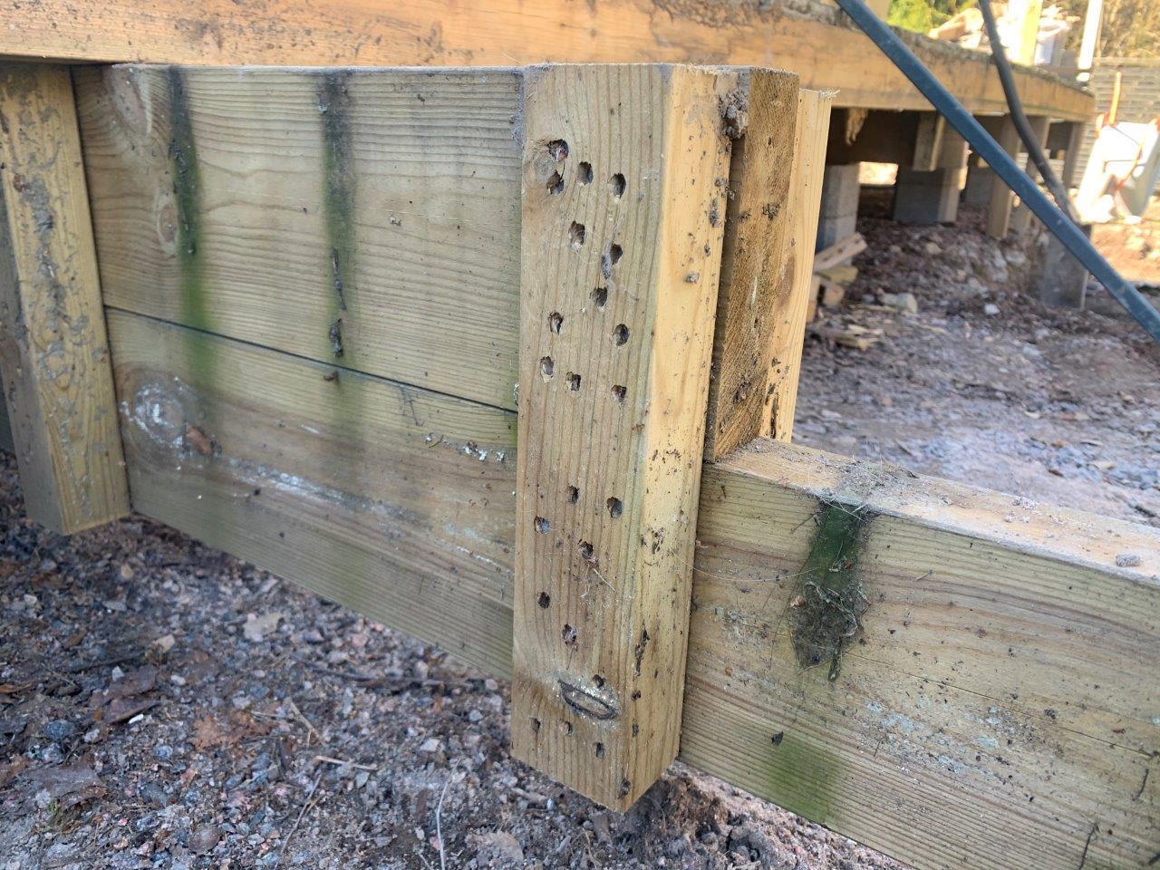 Ennen murskeella täyttöä virittelin istutuslaatikon sisälle patolevyt, jotta maa-ainekset eivät pääsisi värjäämään muuria. Pelkillä kepeillä tuettu patolevy ei pysynyt paikallaan, joten päädyin rakentamaan jämälaudoista ”kauluksen” joka piti patolevyn paikallaan täytön ajan.
