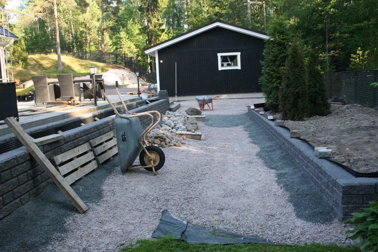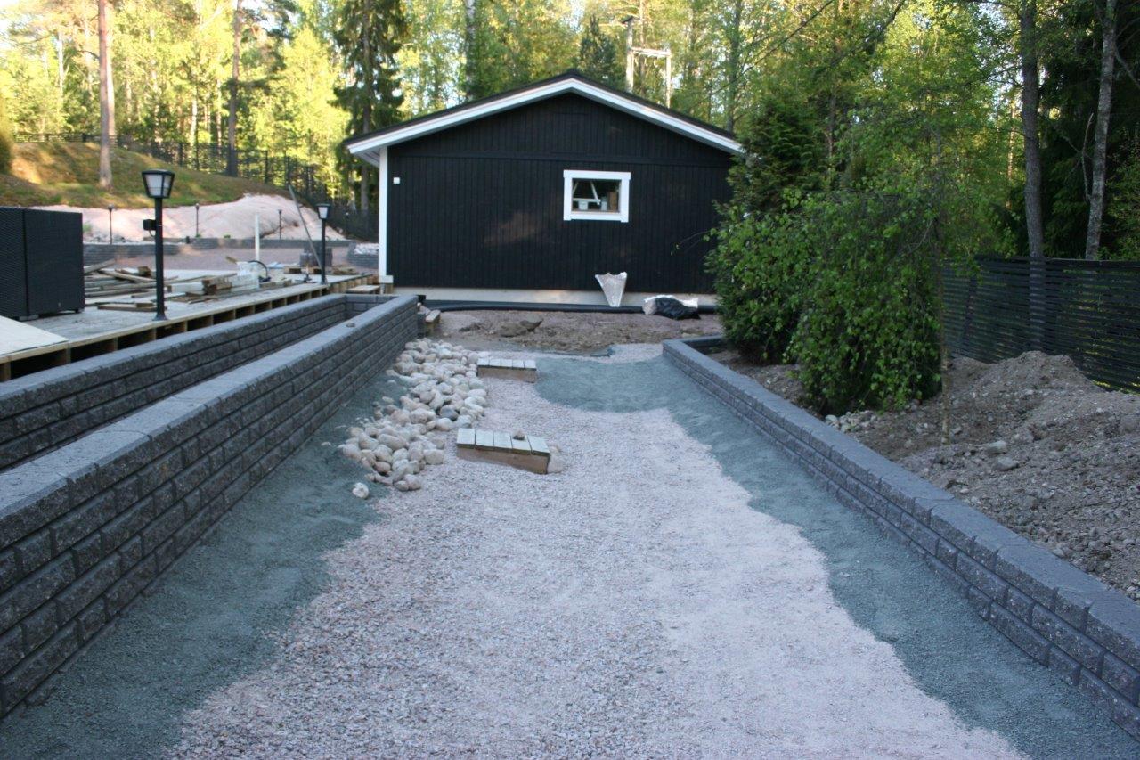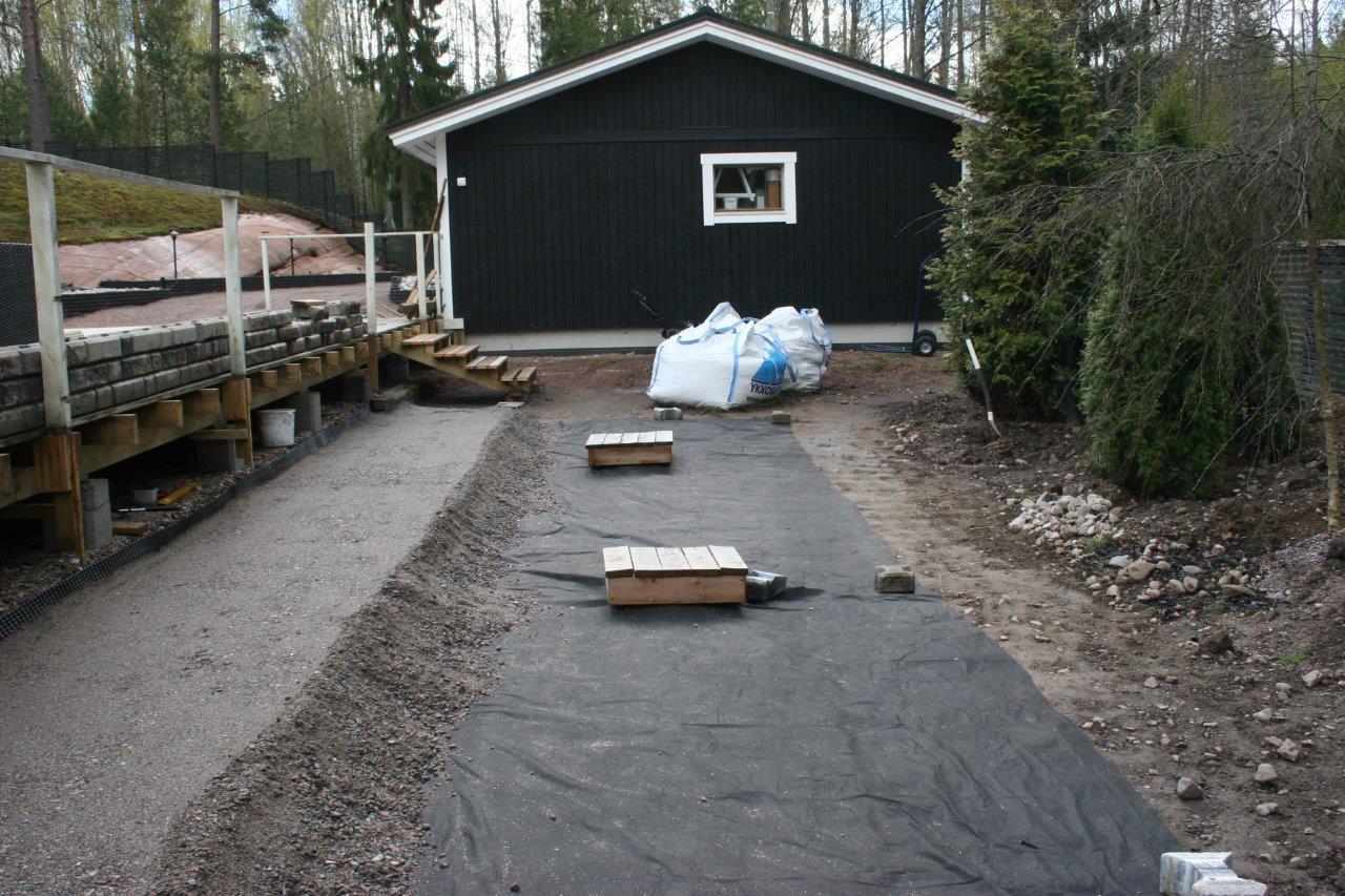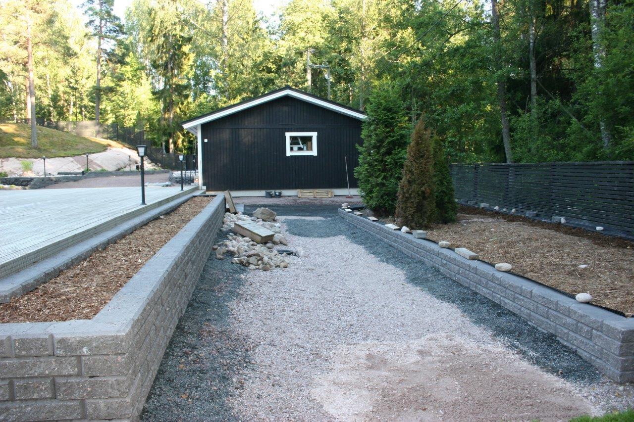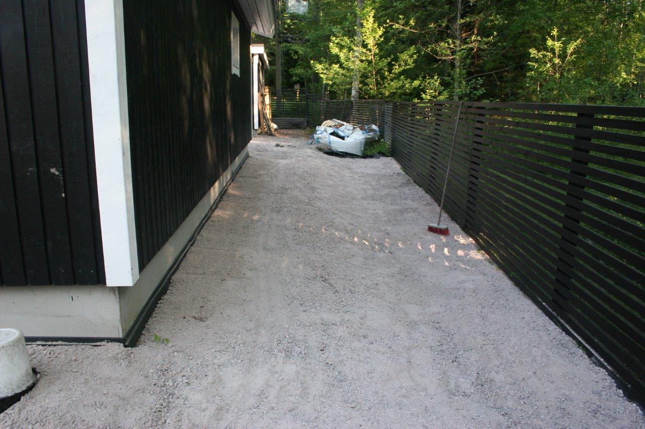 Loppuun auki kaivettujen paikkojen viimeistely. Kulkuväylälle terassin ja aidan väliin tuli 100-150 mm kivistä kivirinne ja varsinaiset kulkuväylät päällystettiin mustalla 0-8mm kivituhkalla. Kun kivituhkan kastelee ja jyrää tulee siitä kevyttä liikennettä hyvin sietävä pinta.