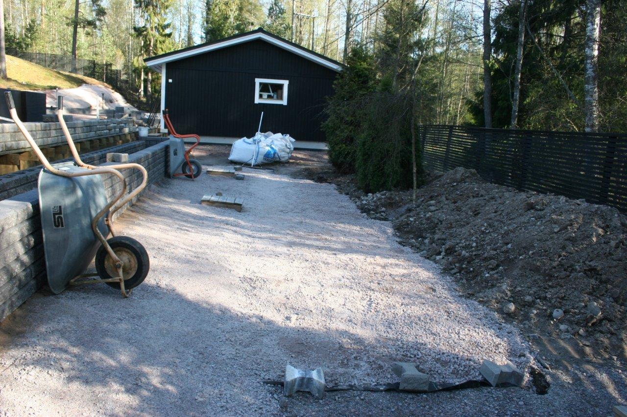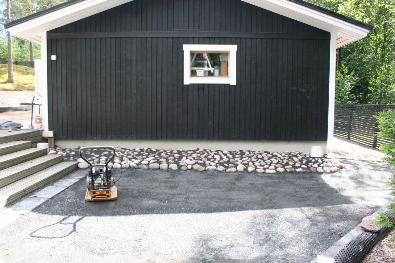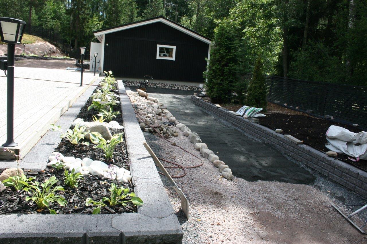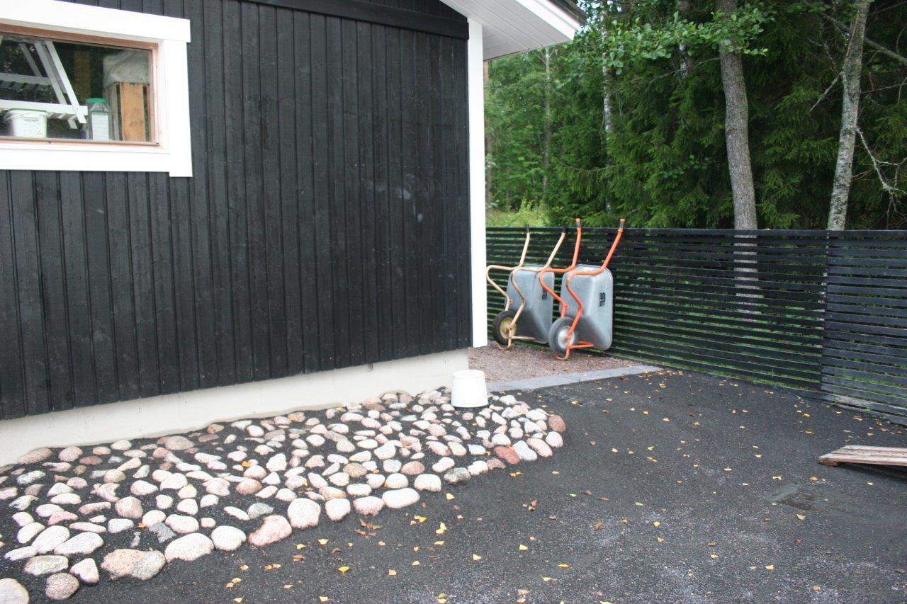 Loppuun auki kaivettujen paikkojen viimeistely. Kulkuväylälle terassin ja aidan väliin tuli 100-150 mm kivistä kivirinne ja varsinaiset kulkuväylät päällystettiin mustalla 0-8mm kivituhkalla. Kun kivituhkan kastelee ja jyrää tulee siitä kevyttä liikennettä hyvin sietävä pinta.