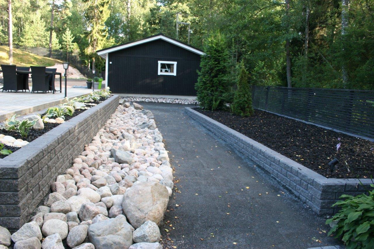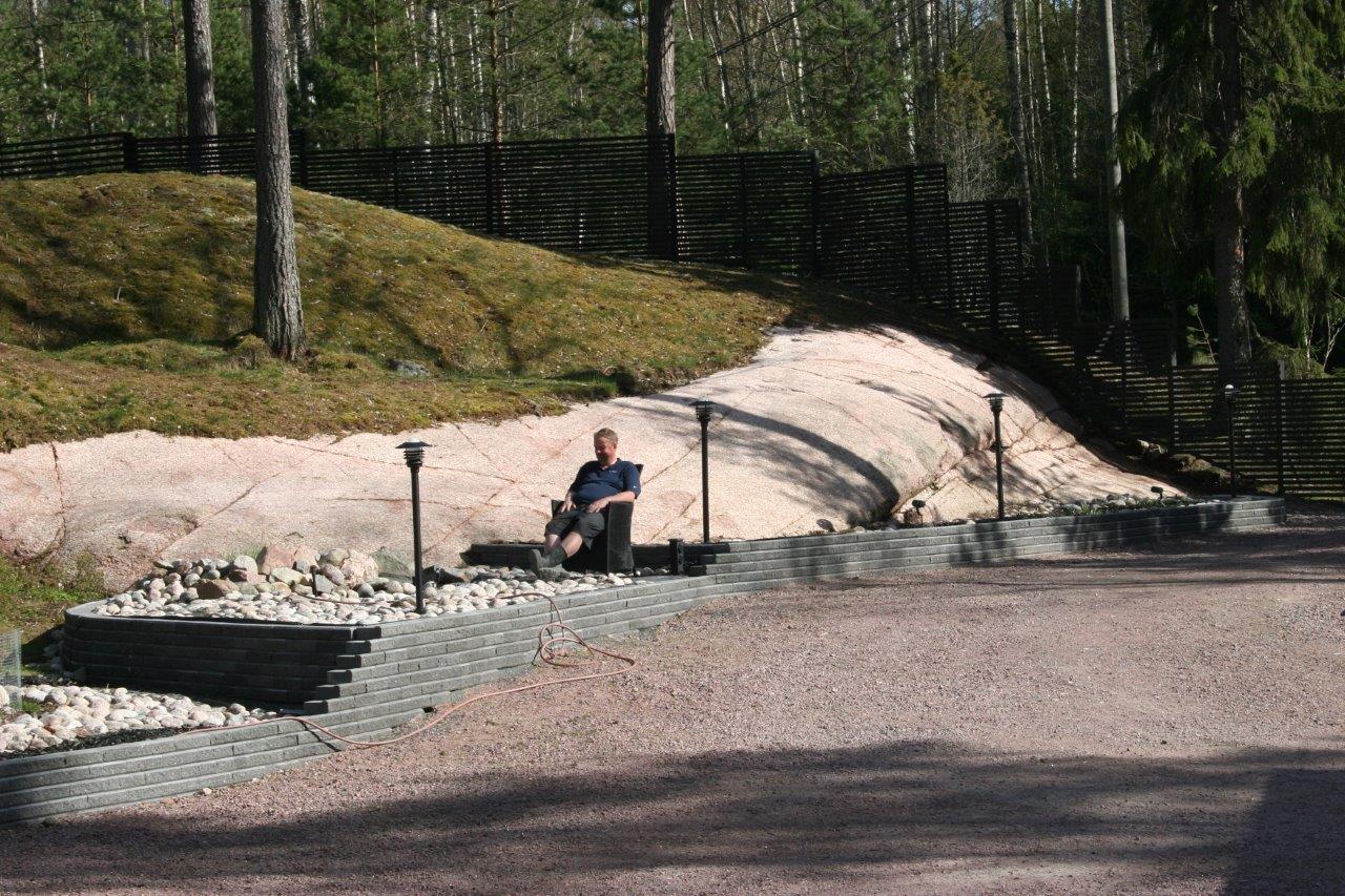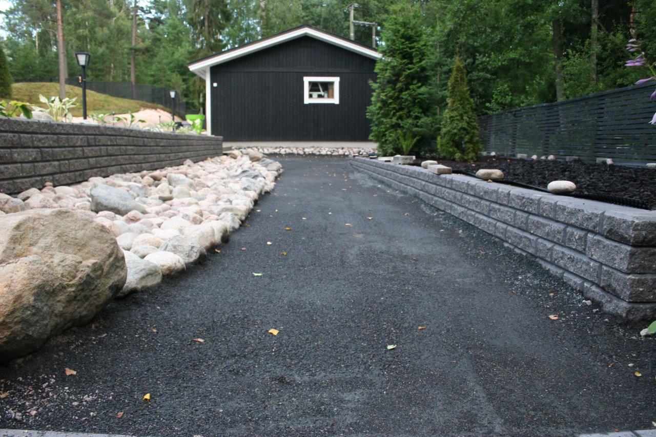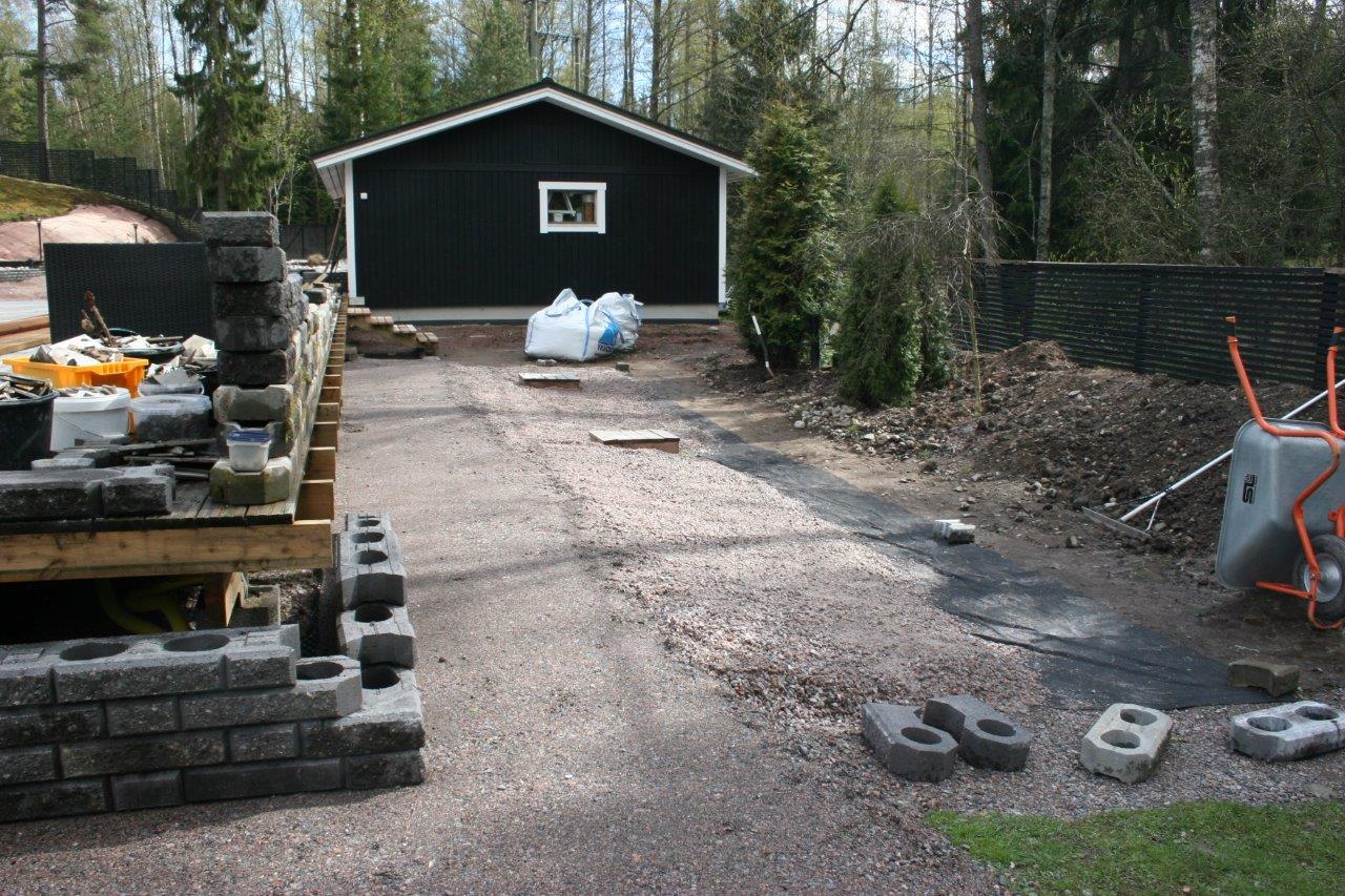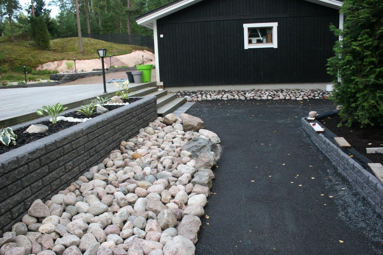 Loppuun auki kaivettujen paikkojen viimeistely. Kulkuväylälle terassin ja aidan väliin tuli 100-150 mm kivistä kivirinne ja varsinaiset kulkuväylät päällystettiin mustalla 0-8mm kivituhkalla. Kun kivituhkan kastelee ja jyrää tulee siitä kevyttä liikennettä hyvin sietävä pinta.