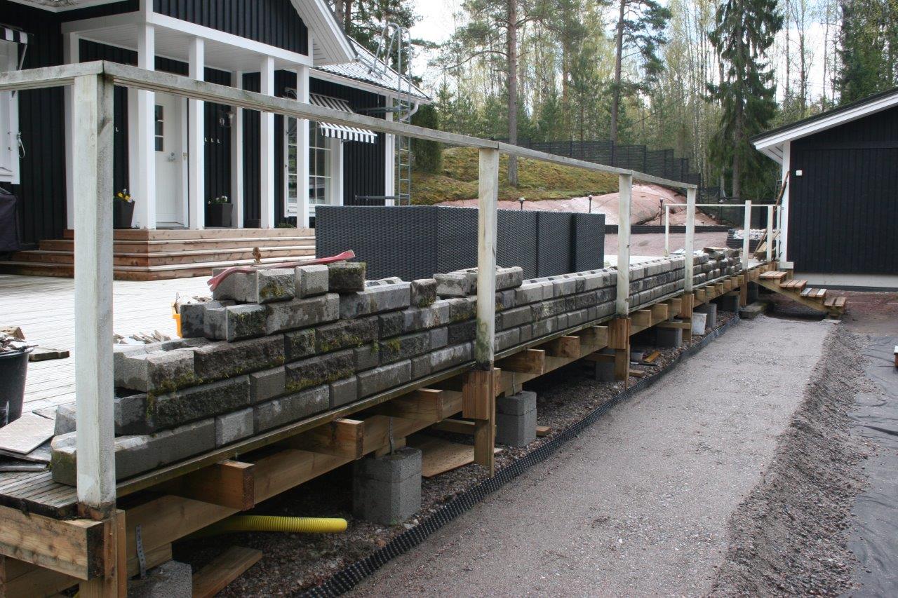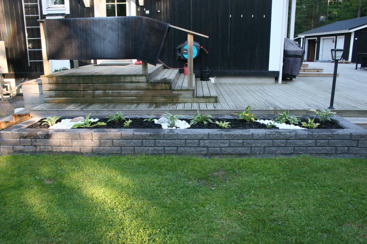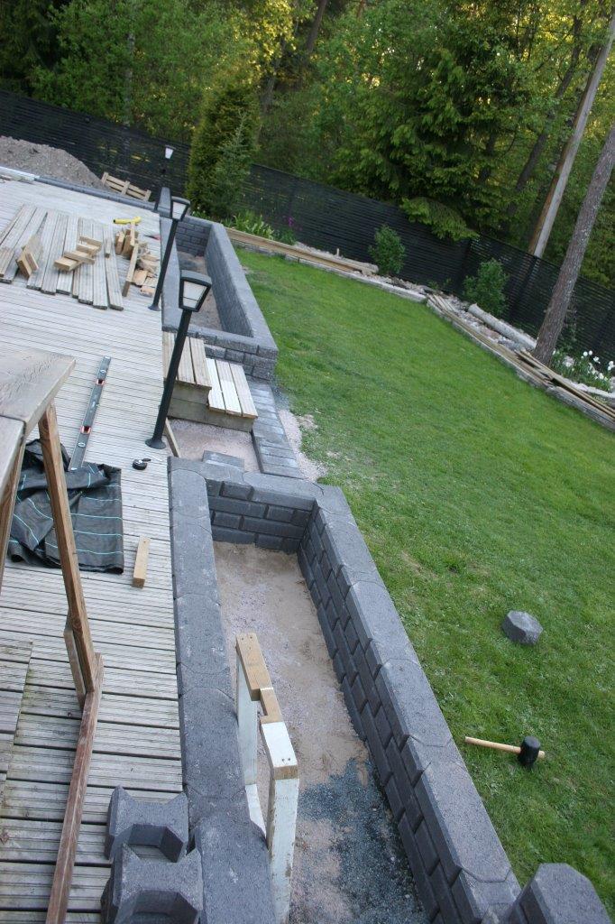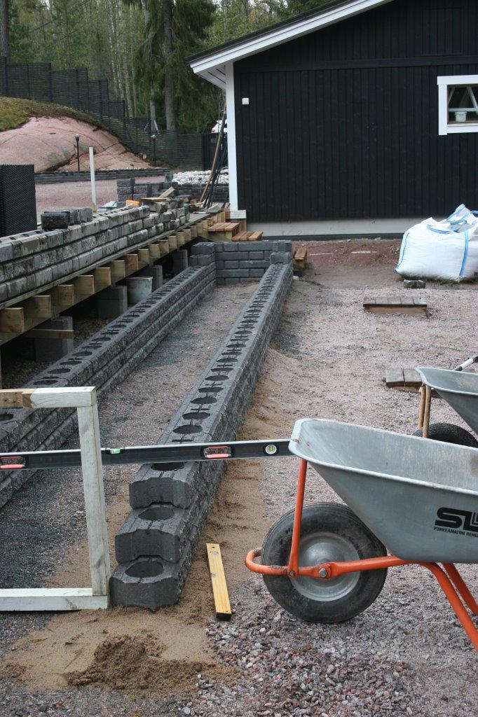 Suunnitelmien lisäksi huolelliset pohjat ovat a ja o. Varsinkin isompien ”muurien” kanssa, omassa muurissa pisin yksittäinen ”veto” oli yli 10 m ja vielä L:n muotoisessa istutuslaatikossa, jossa ulkokulman pitää osua kohdalleen kahdesta eri suunnasta lähestyvän muurinpätkän osalta. Vaikka kuinka yritin vetää pohjat vaateriin, niin näin pitkissä vedoissa tulee helposti heittoja. Eli asennus vaiheessa voi joutua säätämään asennushiekan avulla. Kaikista yrityksistä huolimatta valmiiseen muuriin tuli pieniä heittoja sivu ja korkeus suunnassa. Sivuheittoja voi yrittää naputella suoremmiksi ennen istutuslaatikon täyttöä. Korkeus heittoja on todella vaikea korjata jälkikäteen.