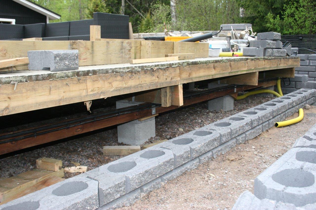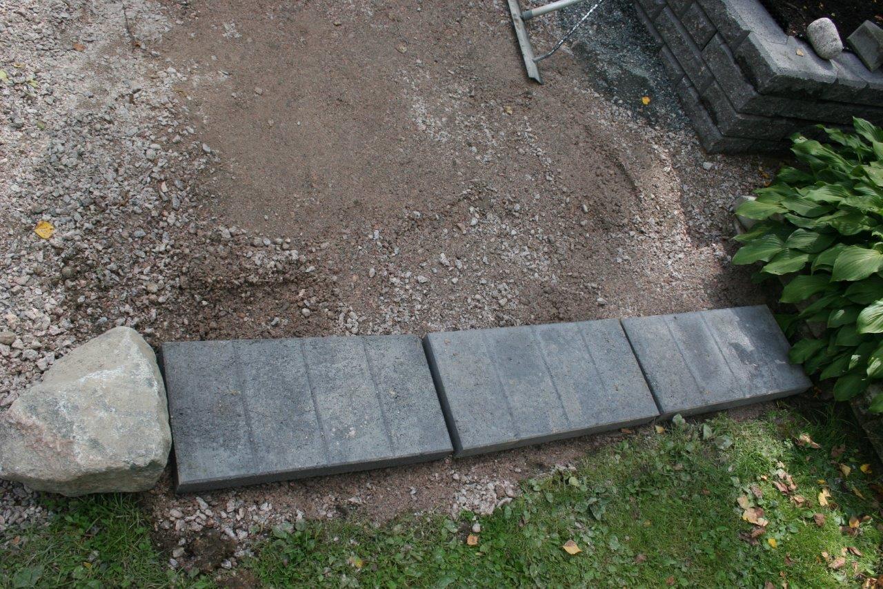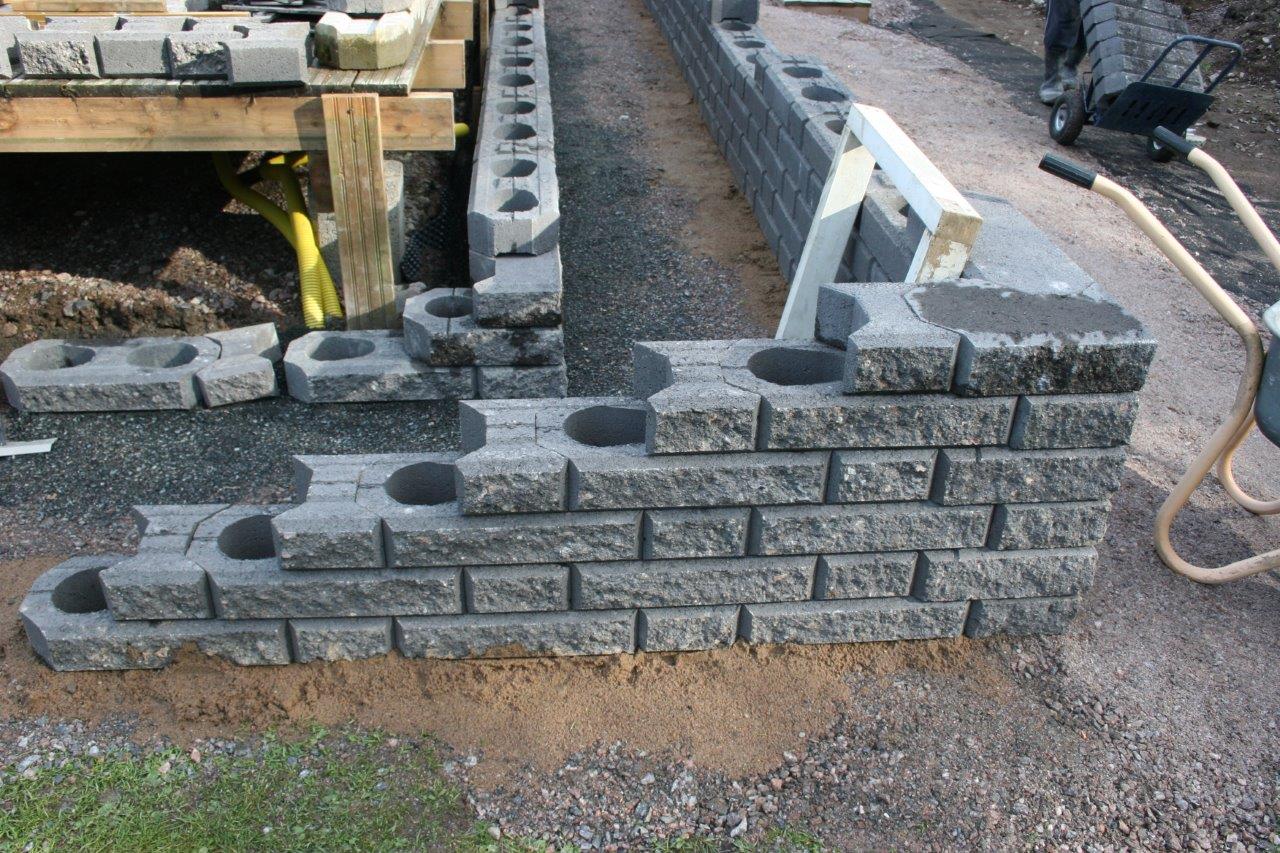 Suunnitelmien lisäksi huolelliset pohjat ovat a ja o. Varsinkin isompien ”muurien” kanssa, omassa muurissa pisin yksittäinen ”veto” oli yli 10 m ja vielä L:n muotoisessa istutuslaatikossa, jossa ulkokulman pitää osua kohdalleen kahdesta eri suunnasta lähestyvän muurinpätkän osalta. Vaikka kuinka yritin vetää pohjat vaateriin, niin näin pitkissä vedoissa tulee helposti heittoja. Eli asennus vaiheessa voi joutua säätämään asennushiekan avulla. Kaikista yrityksistä huolimatta valmiiseen muuriin tuli pieniä heittoja sivu ja korkeus suunnassa. Sivuheittoja voi yrittää naputella suoremmiksi ennen istutuslaatikon täyttöä. Korkeus heittoja on todella vaikea korjata jälkikäteen.