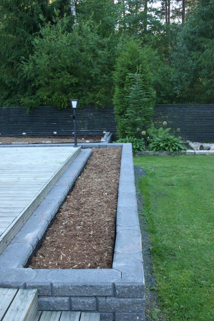 Aidan vieressä oleva istutuslaatikko täytettiin mullalla. Sen sijaan, että oltaisiin tilattu läjä multaa autotallin nurkalle, tilasimme 2xlavaa multasäkkejä (2x65x45 litraa). Näin ei pihalle jäänyt ylimääräistä multaa, johon olisi alkanut kasvaa rikkakasveja. Yksittäiset multasäkit ovat tarpeeksi kevyitä, että niitä jaksaa nostella helposti paikalleen. Istutuslaatikoiden täyttämiseen noin 10-15 cm multakerroksella meni noin 110 säkkiä ja aikaa paloi muutama ilta.