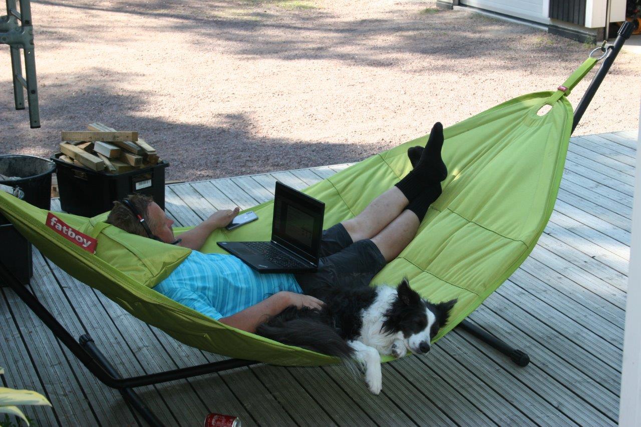 Välillä piti tehdä päivätöitäkin, onneksi säät suosivat ja etäpalaverit hoituivat suurelta osin riippumatossa. Hereillä pysymistä hankaloitti kyljessä kuorsaavat koirat 🙂