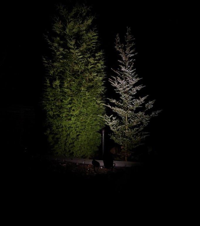Toinen kokeilu oli portin pielessä olevan korkean koivun juurelle. Haaveena oli valaista puu altapäin korkeammalle kuin alkuperäisellä Lily valaisimella. XL valaisimen keila on kuitenkin niin laaja, että merkittävää eroa ei syntynyt.