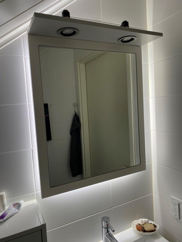 Yläkerran WC:n peili ei varsinaisesti ole kaappi, vaan peilin ympärillä on kaappimainen kehys. Peilin takana on runko, joka on hieman pienempi kuin varsinainen peili. Led-nauha kiinnitettiin tähän runkoon, jolloin sen sai mukavasti piiloon. Jätin kulmissa led-nauhaan hieman löysää, jotta ei tule liian tiukkaa käännöstä, joka mahdollisesti olisi hajottanut led-nauhan.