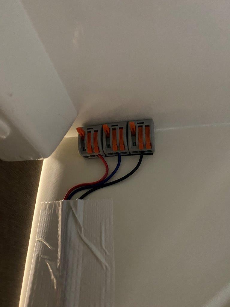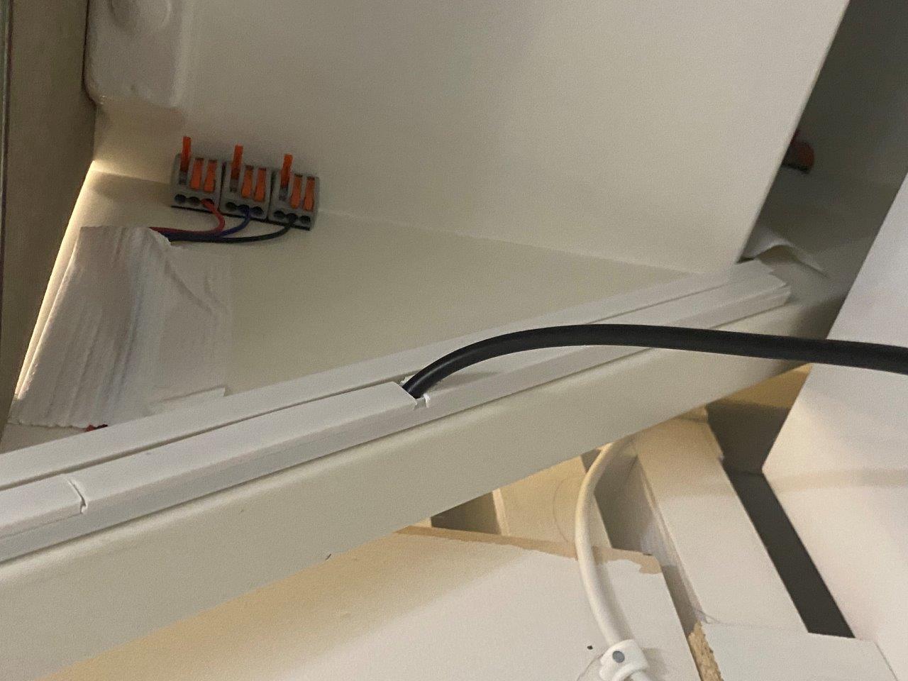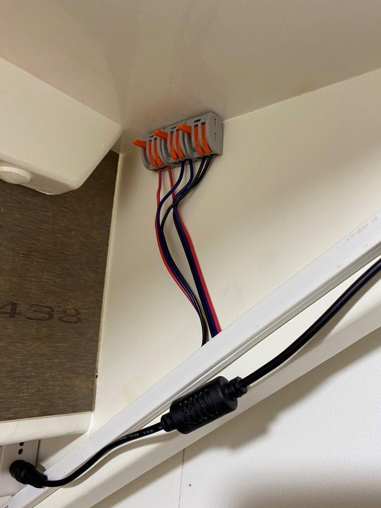 Kuva: Led-nauha paikallaan / piuhat liitetty 5-pin liittimeen, kannattaa noudattaa varovaisuutta piuhoja kiinnittäessä, itsellä irtosi (keltainen) w(arm)w(hite) -piuha led-nauhasta koeyksilön kanssa. Tämä tosin johtuu varmaan siitä, että olin kolvannut johdon itse kiinni led-nauhaan ja juotos oli epäonnistunut/heikko. Tehtaalla juotetut piuhat ovat yleensä paremmin kiinni. Tämän sattumuksen johdosta led-nauha on kiinni vain sinisellä (V+) ja valkoisella (CW) piuhalla liittimessä