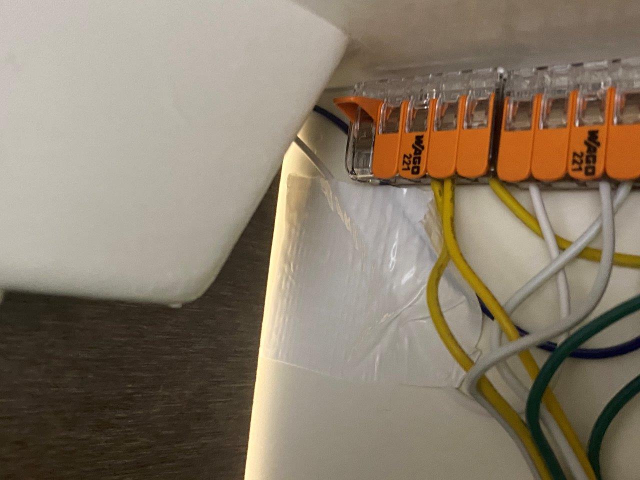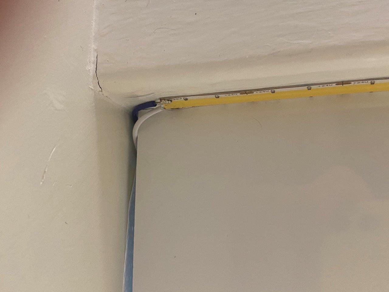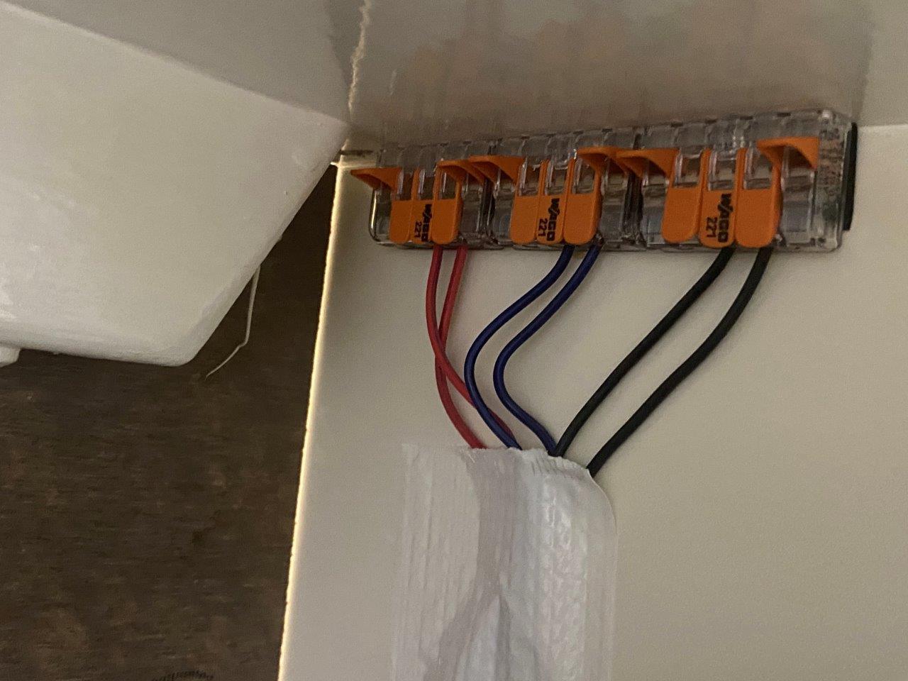 Kuva: Led-nauha paikallaan / piuhat liitetty 5-pin liittimeen, kannattaa noudattaa varovaisuutta piuhoja kiinnittäessä, itsellä irtosi (keltainen) w(arm)w(hite) -piuha led-nauhasta koeyksilön kanssa. Tämä tosin johtuu varmaan siitä, että olin kolvannut johdon itse kiinni led-nauhaan ja juotos oli epäonnistunut/heikko. Tehtaalla juotetut piuhat ovat yleensä paremmin kiinni. Tämän sattumuksen johdosta led-nauha on kiinni vain sinisellä (V+) ja valkoisella (CW) piuhalla liittimessä