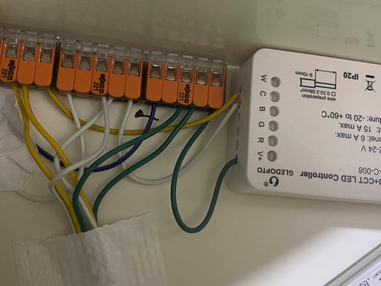 1. Laita virtalähde tai zigbee -kontrolleri virrattomaksi. Led-nauha voi tykätä kyttyrää, jos liität piuhoja, kun virrat on päällä