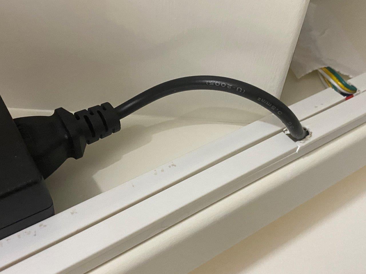 10. Liitä Virtalähde pistorasiaan ja pujota piuhat johtokouruun. Itsellä oli käytössä erillinen johtokouru virtalähteen piuhoja varten. Kolvilla voi tehdä tarvittaessa johtokourun kanteen reikiä piuhoille