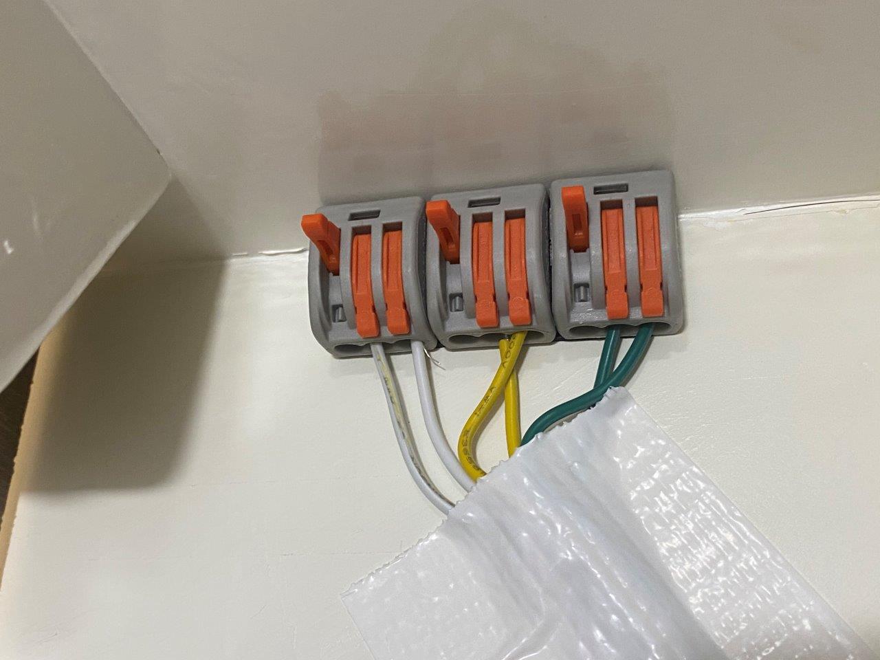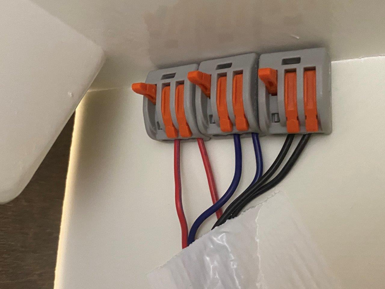 Kuvia: Piuhoja kiinni liittimissä / johtokourun sisällä, 3-pin liititmissä kaikkein vasemman puolimmaiset vipuliittimet vielä auki odottamassa led-nauhan kytkentää. 5-pin liittimessä auki vasemman puoleisin liitin led-nauhan liitosta varten ja oikean puoleisin auki zigbee -kontrollerin liitosta odottamassa