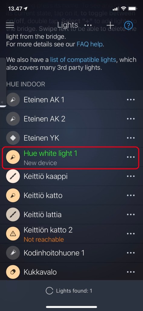 Kuva: Juuri lisätty SM309 älyhimmennin iConnectHue applikaatiossa