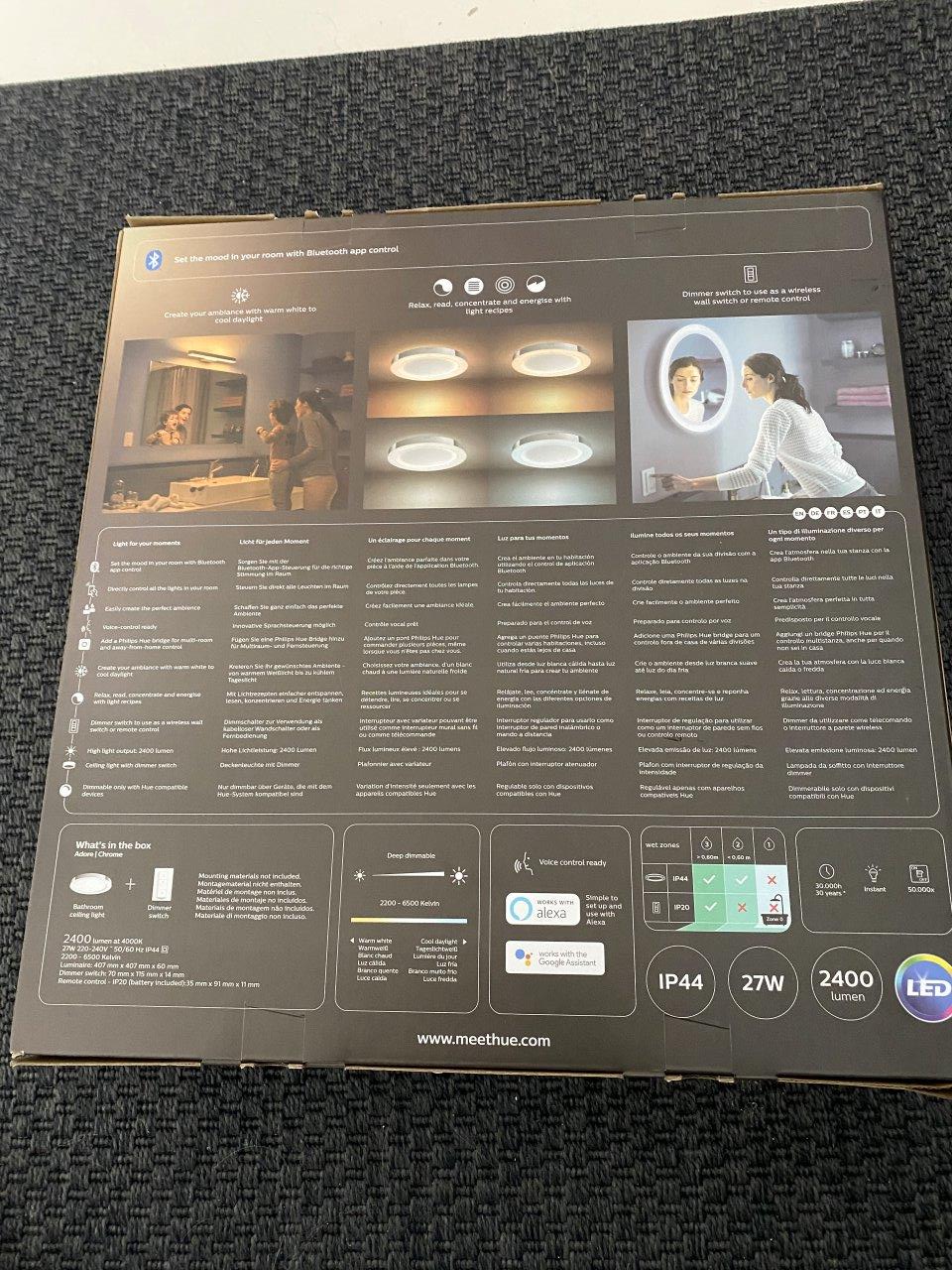 Philips Hue Adore tuoteperhe on suunniteltu myös kosteisiin tiloihin asennettavaksi ja sarjan valaisimissa on IP44 tasoinen suojaus, eli kestää roiskevettä. Adore -sarjasta löytyy eri mallisia valaisimia: peilivalaisin, kohdevalaisin, alasvalo, kattospottivalaisin ja kattovalaisin. Itse päädyin jälkimmäiseen.