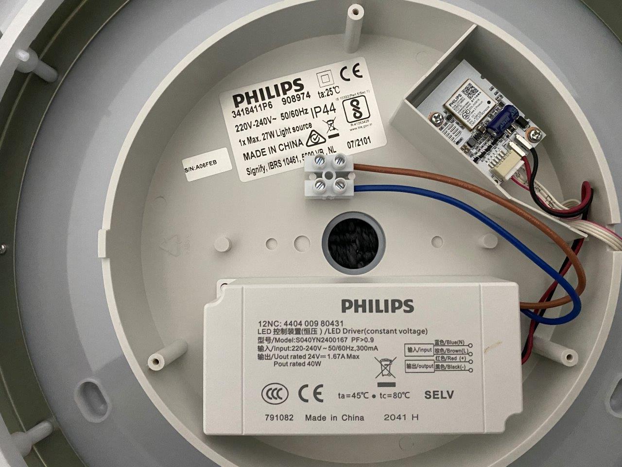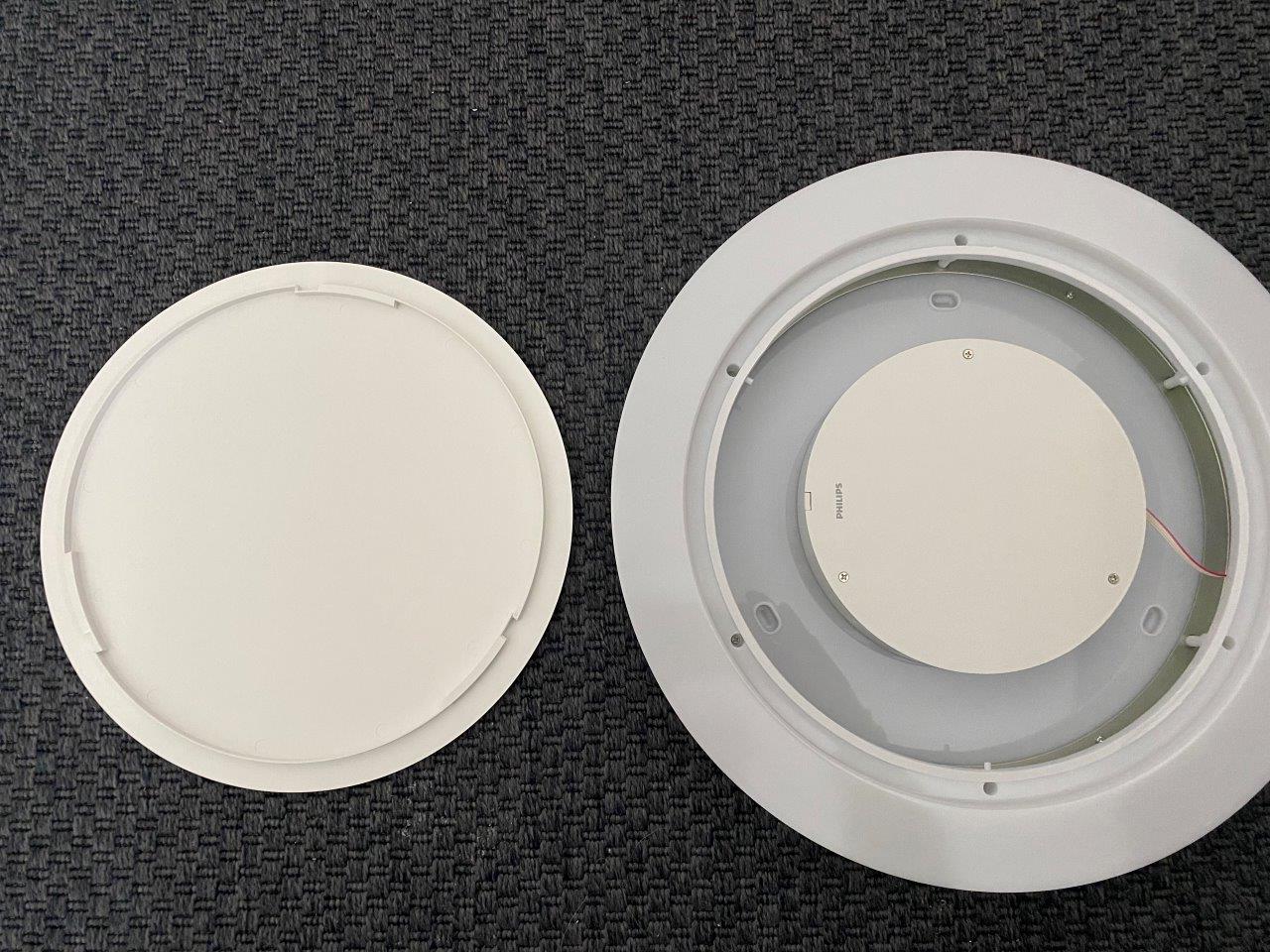 IP44 suojaustasosta johtuen erilaiset aukot on suojattu paremmin, mutta muuten valaisimessa on aika samanlaiset palikat kuin aiemmin kodinhoitohuoneeseen asennetussa Hue Being -kattovalaisimessa. Valonlähde on led-nauha, joka kiertää valaisimen kehää. Tällä kertaa led-nauha on piilotettu valaisimen rungon sisään, eikä yksittäisiä ledejä näy ilman, että purkaisi valaisinta enemmän.