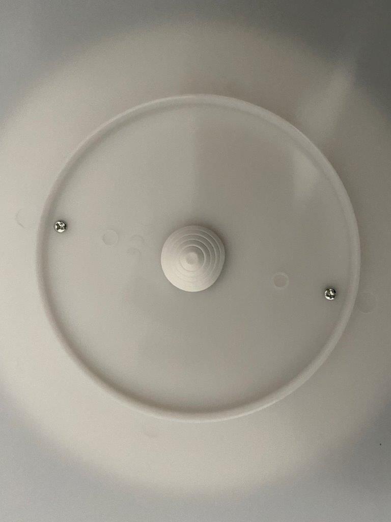 Painamalla reunoista ja pyörittämällä keskellä oleva pyöreää peitinlevyä sen saa liikahtamaan ja irtoamaan valaisimen rungosta. Seuraavaksi kolme ruuvia irti keskellä olevasta kannesta, jonka alta paljastuu virtalähde + muut sähköiset komponentit.