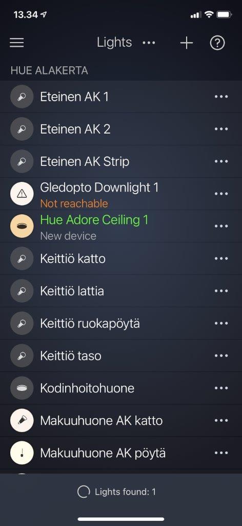 - Valaisimen pitäisi löytyä uutena valaisimena kun laittaa valaisimien etsimisen päälle applikaatiosta