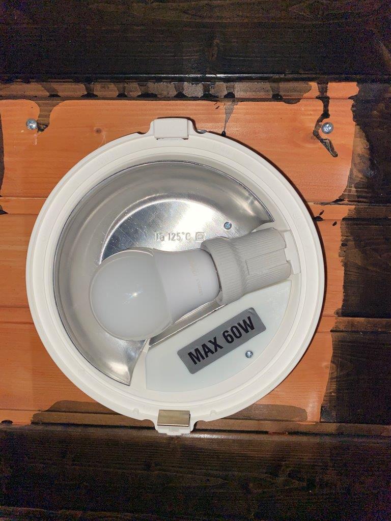 No asiaa tarkemmin tutkittuani havaitsin, että saunan valaisimen sisällä onkin ihan tavallinen E27 led-polttimo. Korkea käyttölämpötila yleensä lyhentää led-polttimoiden elinikää, mutta ilmeisesti lauteiden alla on sen verran viileämpää, että polttimo kestää suhteellisen hyvin. Ei ole ollut tarvetta vaihtaa kyseistä polttimoa viimeisen kolmen vuoden aika, eli sinä aikana kun olemme nykyisessä talossa asuneet