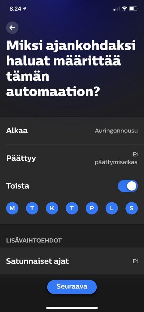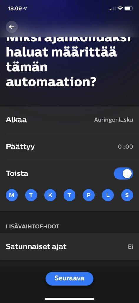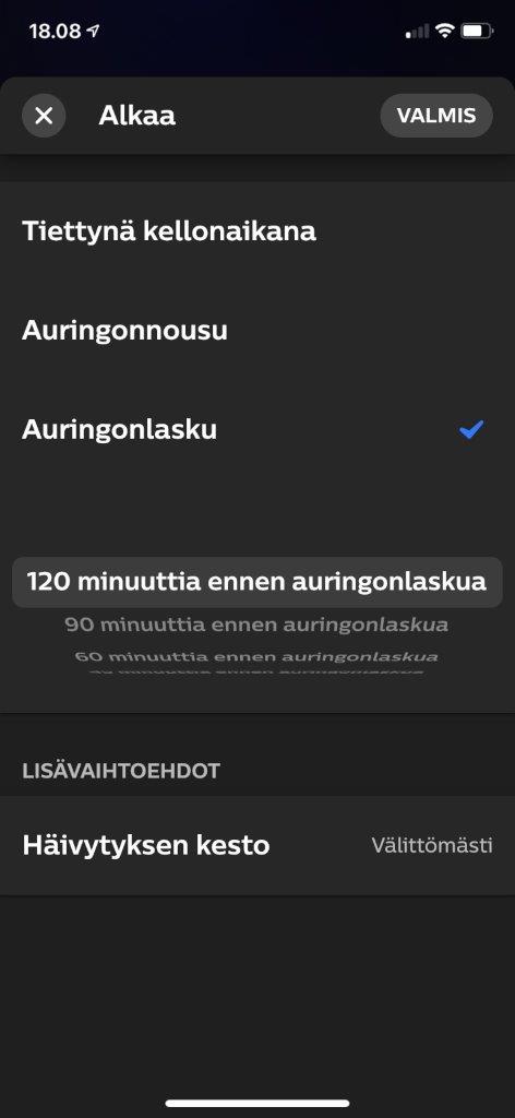 Ehkä vähemmälle huomiolle on jäänyt valojen ajastamiseen liittyvien asetusten uudet mahdollisuudet. Tässä postauksessa tutkitaan mitä uutta on tullut auringonlaskuun / auringonnousuun linkitettyihin valaisimien ajastuksiin.