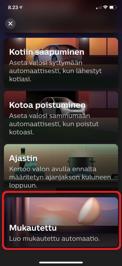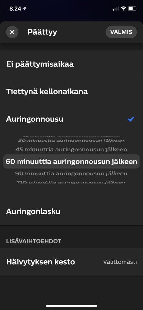 - iConnectHue applikaatiossa pystyy määrittämään erikseejastuksille ajanjakson lopulle oman toiminnon