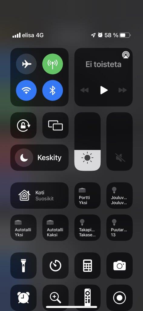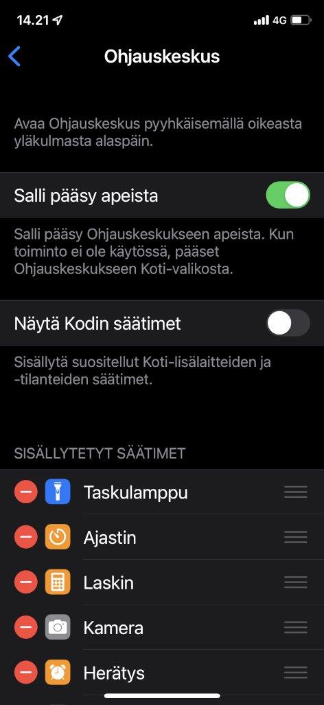 ”Asetukset – Ohjauskeskus” alta löytyy ”Näytä kodin säätimet” asetus. Jos tämä asetus on päällä tulee puhelimen oikeasta ylänurkasta alasvedettävään ”Ohjauskeskus” valikkoon Apple Home:n suositellut laitteet näkyviin. Jos Apple Homesta on valittu suosikkeihin tarpeeksi laitteita ilmestyy näiden laitteiden ikonit, muussa tapauksessa valikkoon ilmestyy näkyviin jotkut satunnaiset laitteiden ikonit.