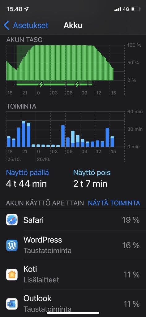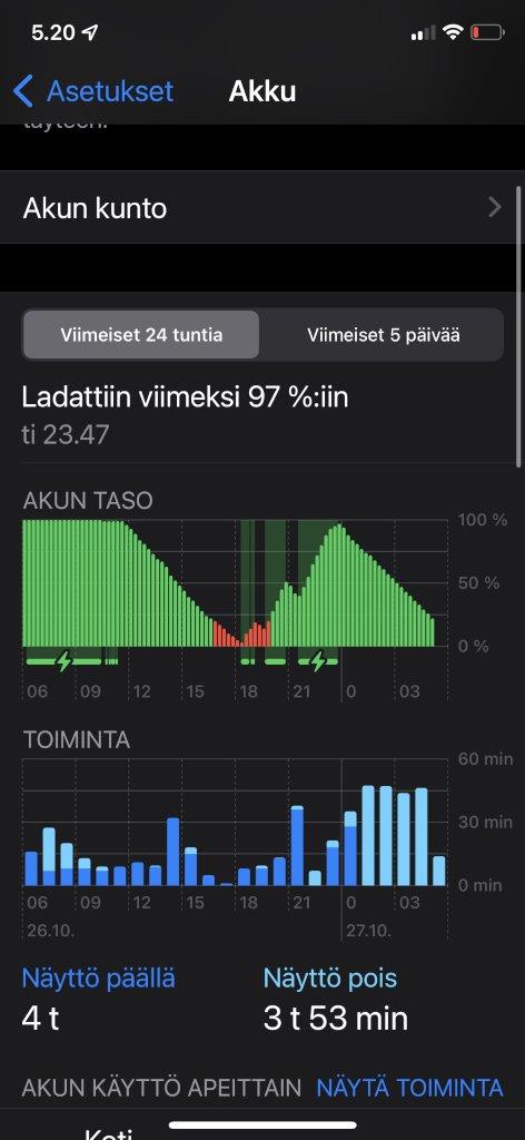 Ensimmäisestä kuvasta näkee, että yön tunteina noin klo 01 – 05 akun kulutus on tapahtunut, kun näyttö on ollut pois päältä (vaalean sininen väri). Sivuhuomautuksena: Kyllä, olisi hyvä nukkua enemmän kuin neljä tuntia yössä…