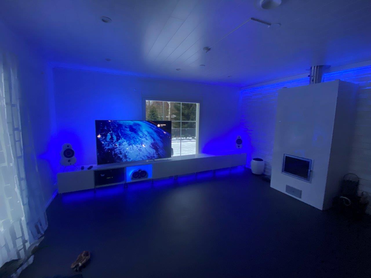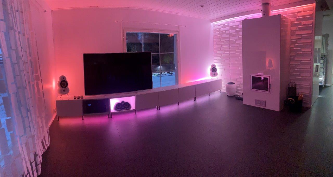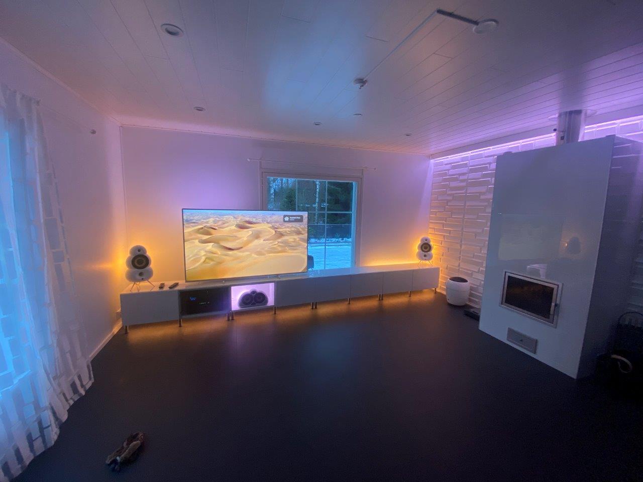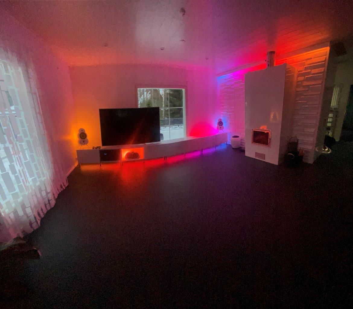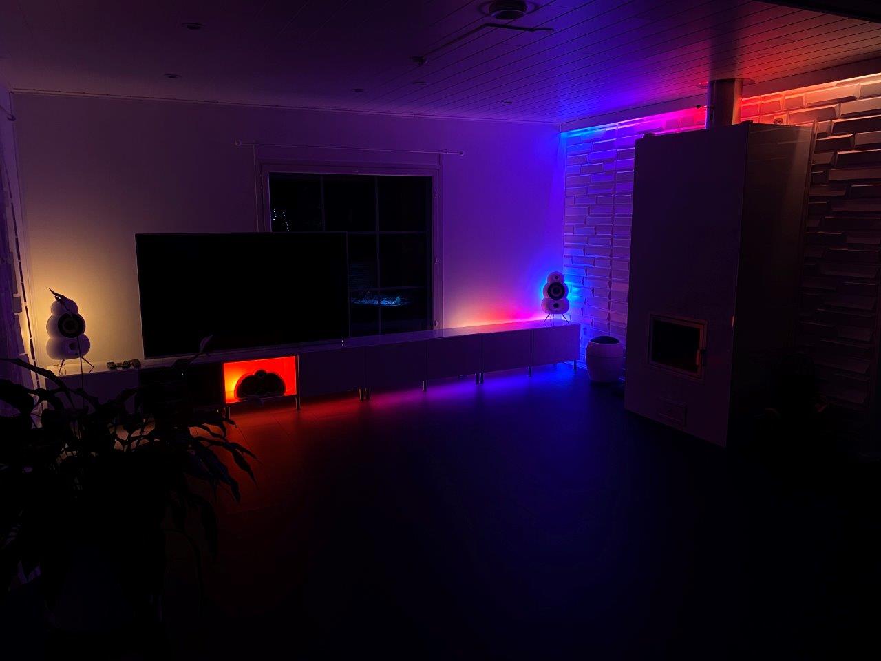 - Kaikissa kuvissa käytössä olevat 3 x Gradient Lightstrip (takan päällä, tv-tason alla ja tv-tason päällä oikeassa laidassa) näyttää vain yhtä väriä
