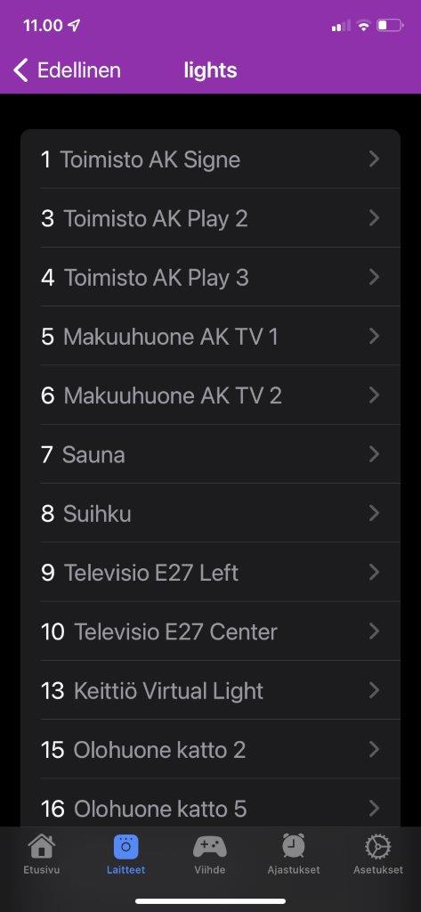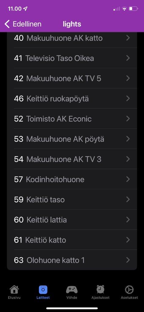 - Listalla viimeisenä valaisimena näkyy ”Keittiön ruokapöytä”, jonka järjestysnumero on Hue Essentials applikkaation mukaan ”46”