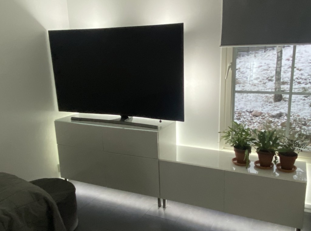 Lidlin led-nauha päätyi lopulta alakerran makuuhuoneessa olevan TV-tason taustalle. Tässä käytössä minimikirkkaus on siinä rajoilla, että riittääkö. Tulee toimeen, mutta voisi himmetä enemmänkin. Ehkäpä tännekin tulee jossain vaiheessa hankittua aito Hue tilalle…