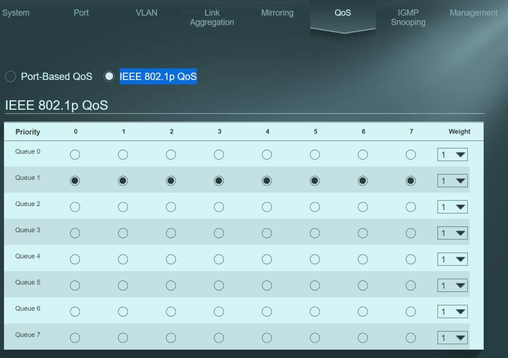 Kun en ominaisuudelle keksinyt varsinaisesti käyttöä tai keksinyt miten sen saisi kokonaan pois päältä, päädyin laittamaan molempiin kytkimiin IEEE 802.1p Qos tilan päälle. Standardin mukaan jos paketeissa ei ole määritelty prioriteettia ohjautuu se QoS jonoon nimeltä ”Queue 1”. Eli oman käsityksen mukaan kaikki verkossa menevä liikenne pitäisi mennä tähän jonoon. Kun lisäksi kaikille jonon prioriteeteille on asettu sama painoarvo tai ”weight”, pitäisi käytännössä QoS olla pois päältä, kun kaikki liikenne saa saman verran resursseja.