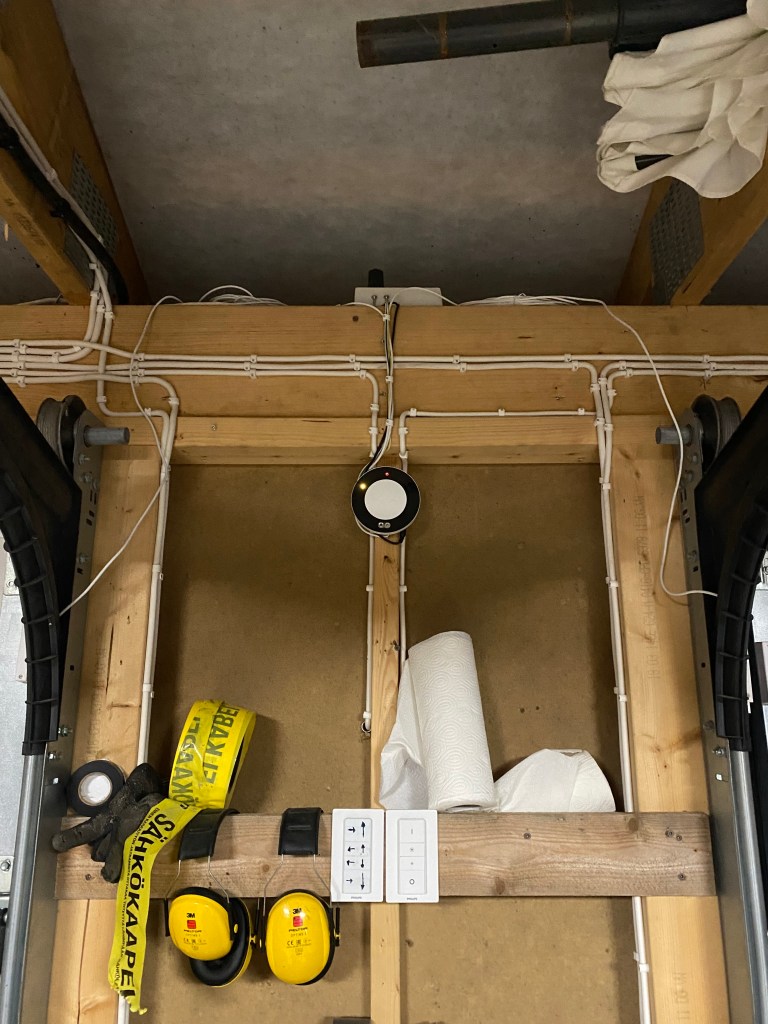 Lopuksi testausta, jotta näkee, että sensorin osat eivät jää jumiin oven liikkuessa. Testaus on helpompi tehdä oven alkuperäisellä kauko-ohjaimella, jolla saa avautumisen tai kiinni menemisen keskeytettyä painamalla avaus nappia uudemman kerran. Kun nappia painaa vielä yhden kerran lisää lähtee ovi liikkumaan vastakkaiseen suuntaan.
