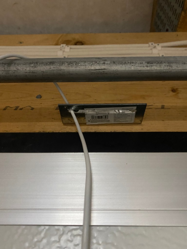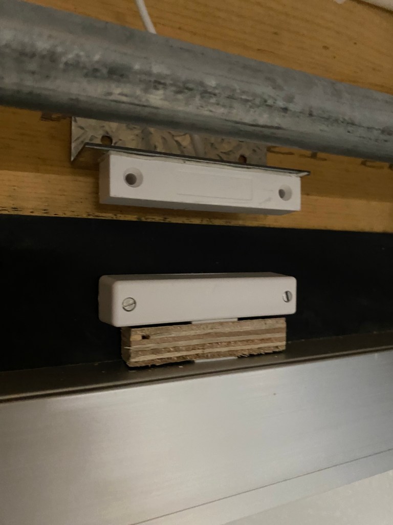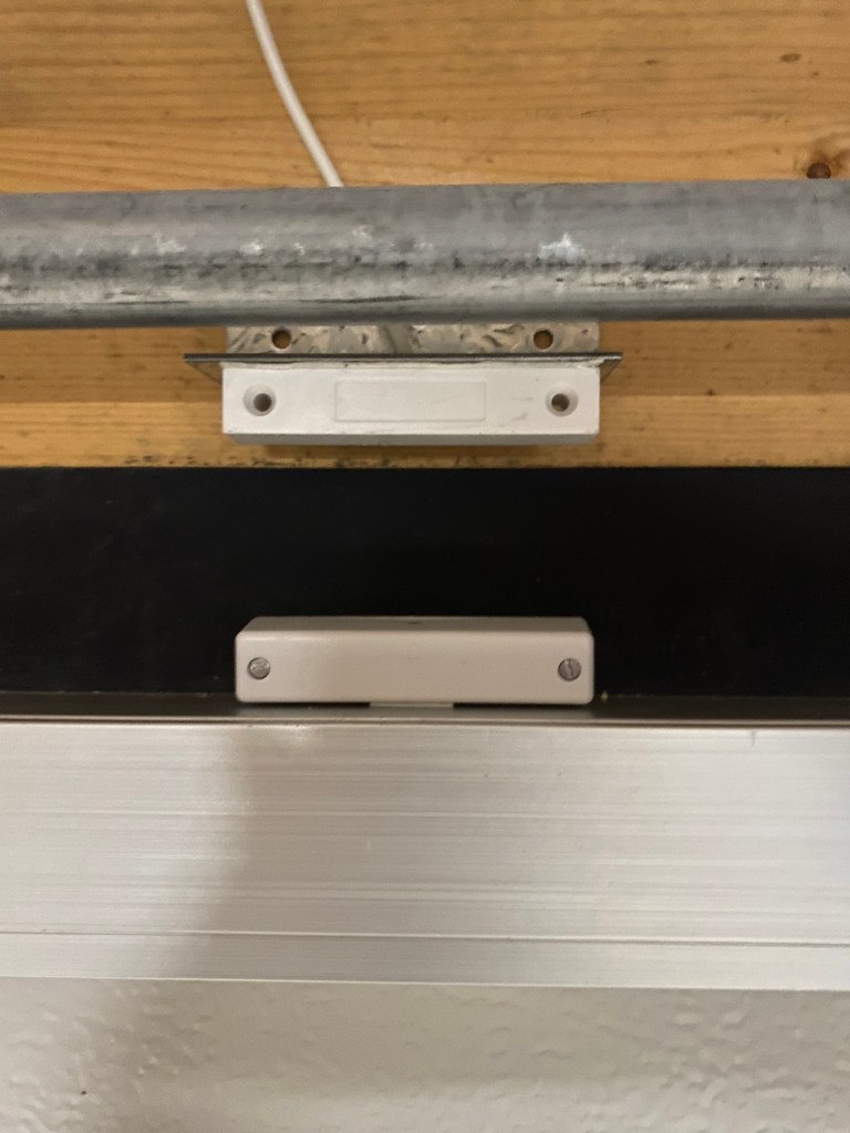 Toisen oven kohdalla yritin aluksi laittaa sensorit kiinni kapeamman raon yli, mutta rako oli liian pieni ja sensoreiden asentaminen liian ahtaaseen väliin osoittautui huonoksi ideaksi. Kun ovi avautui, tarttui sensori kiinni oven liikuttelumekanismiin ja lähti irti kiinnityksestään. Onneksi sain pysäytettyä oven ajoissa natiivi kauko-ohjaimella ja sensori ei hajonnut… Ei ollut kovin kaukana. Lopulta päädyin siirtämään sensorin oven toiselle sivustalle, jossa oli samanlainen noin 5 cm rako kuin ensimmäisessä ovessa.