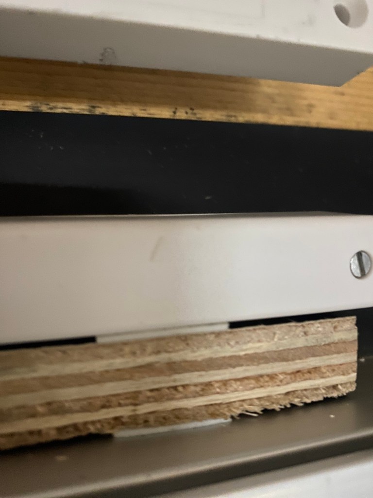 Seuraavaksi sensori ja vastakappale kiinni kaksipuolisella teipillä. Aluksi kokeilin laittaa vastakappaleen suoraan oveen kiinni, mutta väliin jäi noin 4-5 cm, mikä olisi ollut ehkä liikaa ja sensori ei olisi välttämättä toiminut. Laitoin väliin pienen pätkän rimaa ja nyt väli oli aika tarkkaan speksien mukainen maksimi, eli 3 cm. Ehkä pitää vaihtaa puupalikka samanlaiseen kulmarautaan kuin mihin sensori on kiinnitetty, niin on siistimmän näköinen.