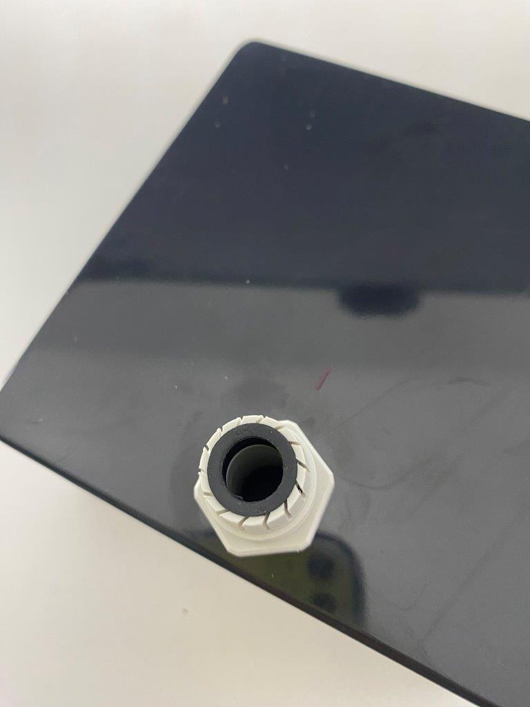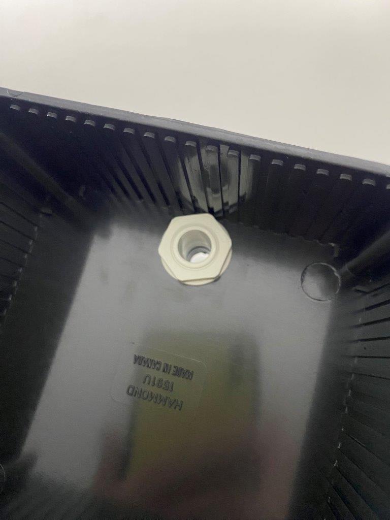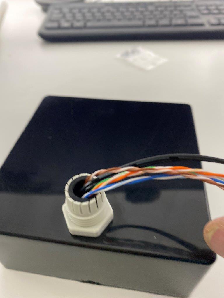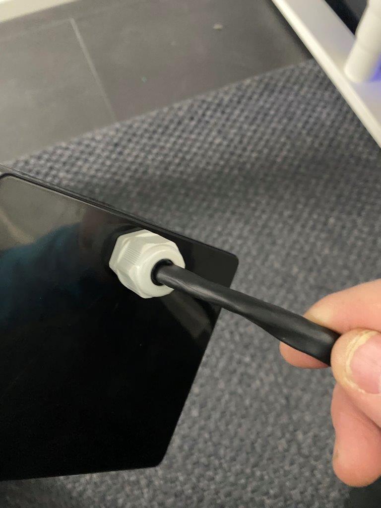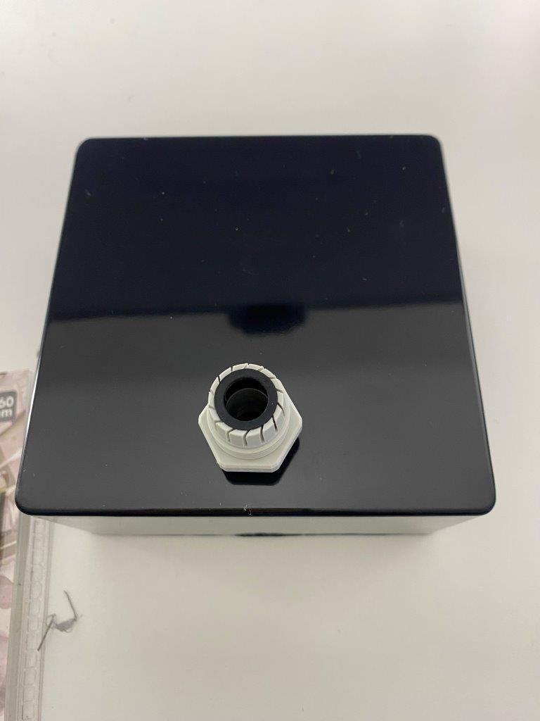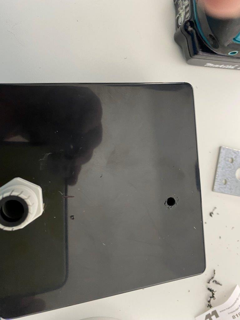 Portin kotelossa laitoin M12 läpiviennin kotelon nurkkaan, jolloin se tuli suunnilleen suoraan iSmartgate laitteen 5DC liittimen alapuolelle ja turhaa piuhaa ei jäisi kotelon sisälle. Tämä osoittautui ei-optimaaliseksi suunnitelmaksi, liitin on niin pitkä, että ei meinaa mahtua kotelon sisälle. Jotta palikat mahtui kotelon sisälle, piti iSmartgate asentaa koteloon hieman vinoon. Ei ehkä muuta haittaa kuin, että näyttää vähän hassulta.
