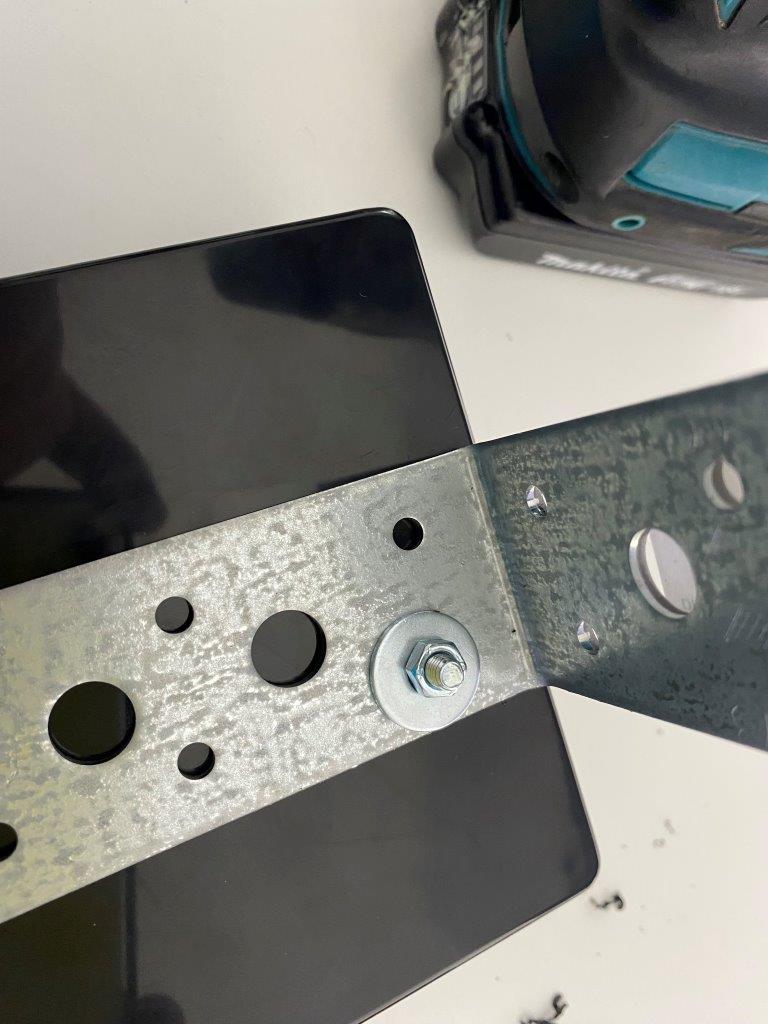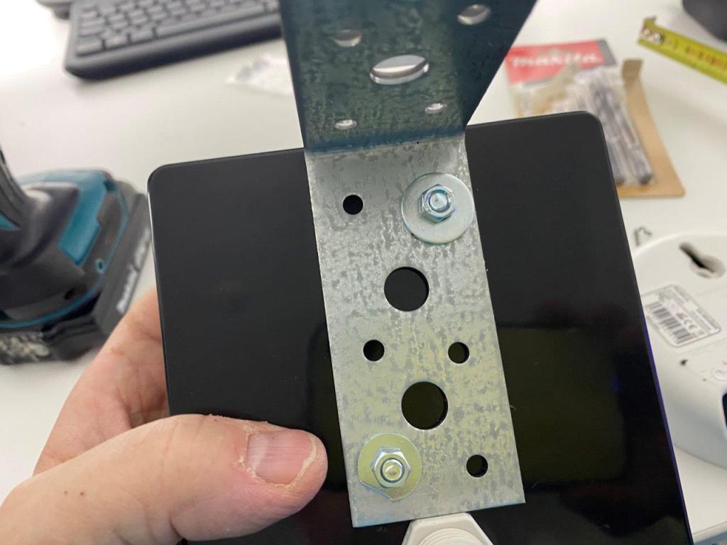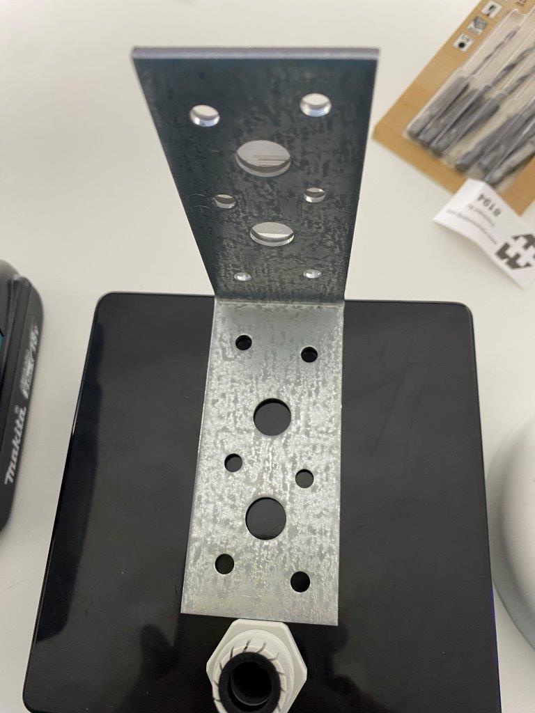Kiinnitetään kulmarauta portin metalliseen tolppaan ja kotelo tähän kulmarautaan. Porataan tolppaan pari reikää, jonka kautta piuhat saa pujotettua tolpan sisään piiloon. Kun ”rauta” on paikallaan, on aika kytkeä piuhat ja testata muutokset wifin RSSI arvoon. Lopuksi olisi hyvä testata, että iSmartgate toimii ja saa portin auki/kiinni iSmartgate ja Apple Homekit applikaatioista.