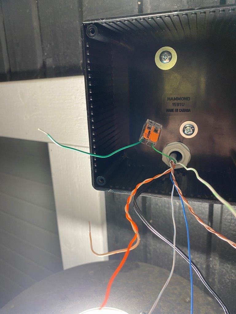 Kun wifi oli todettu toimivaksi, alkoi kontrollipiuhojen kytkentä. Aluksi iSmartage kontrolleri pois virroista ja kontrollipiuhojen kytkentä iSmartgate laitteen ”portteihin”. Seuraavaksi Ethernet-kaapelin pujottaminen autotallissa kohti iSmargate kontrollerin aiempaa asennuspaikkaa. Täällä oli odottelemassa aiemmin käytetyt neljä paria kontrollipiuhoja. Ruuvasin seinälle asennusrasian ja pujotin piuhat läpivienneistä rasian sisään ja kytkin piuhat toisiinsa WAGO-tyyppisillä liittimillä. Sensorien piuhoissa käytin 2-johtimen liittimiä, yksi liitin per väri. Avauspiuhoihin laitoin 3-johtimisen liittimen, näin voin helposti tarvittaessa lisätä langallisen avauspainikkeen oville. Hue Dimmer -älykatkaisimen käyttö autotallin ”avaus-nappina” ei ole aina toiminut ihan niin kuin toivoisi ja tässä kohtaa vanha keino voi olla parempi kuin pussillinen uusia.