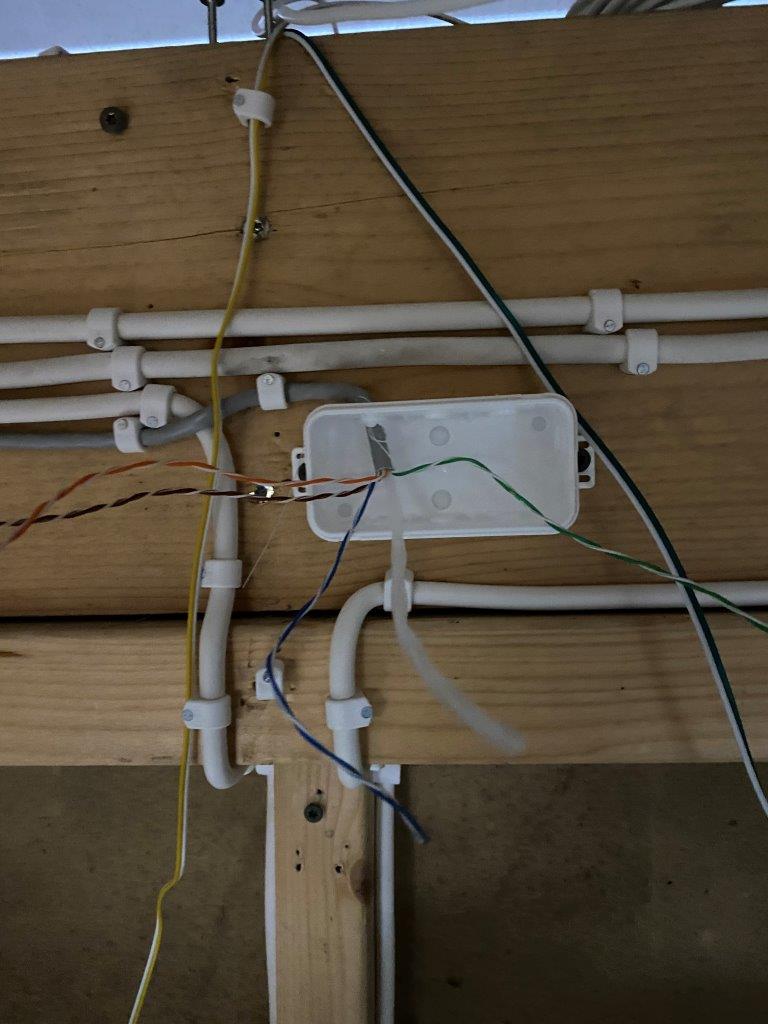 Vaikeampi osuus autotallissa oli suurempi määrä kontrollipiuhoja. Portilla kontrollipiuhassa oli vain kaksi johdinta, autotallissa tarvittiin neljä kahden johtimen nippua. iSmartgaten mukana tulleet piuhat ovat paksuudeltaan amerikkalaisen standardin AWG24, eli noin 0,25mm². Sen sijaan, että olisin vetänyt jokaiselle neljälle johdinparille oman piuhan, päädyin käyttämään Cat6 ethernet -kaapelia, joka on paksuudeltaan AWG24.